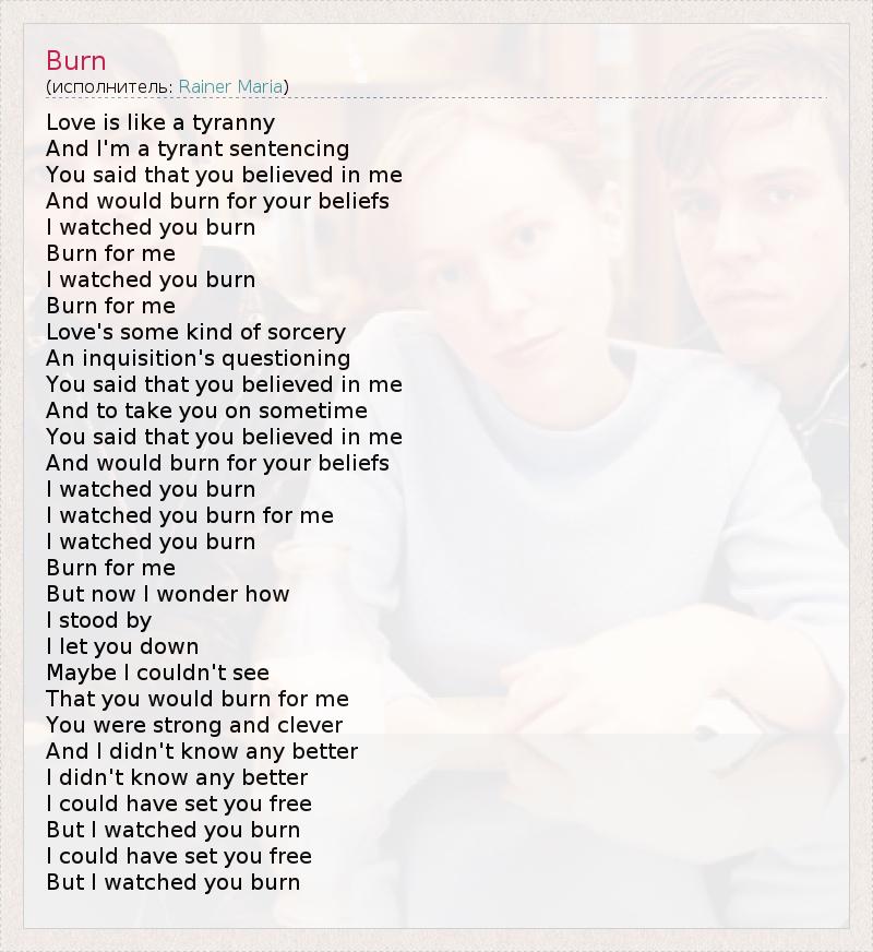 Love is like a tyranny And I'm a tyrant sentencing You said that you believed in me And would burn for your beliefs I watched you burn Burn for me I watched you burn Burn for me Love's some kind of sorcery An inquisition's questioning You said that you believed in me And to take you on sometime You said that you believed in me And would burn for your beliefs I watched you burn I watched you burn for me I watched you burn Burn for me But now I wonder how I stood by I let you down Maybe I couldn't see That you would burn for me You were strong and clever And I didn't know any better I didn't know any better I could have set you free But I watched you burn I could have set you free But I watched you burn