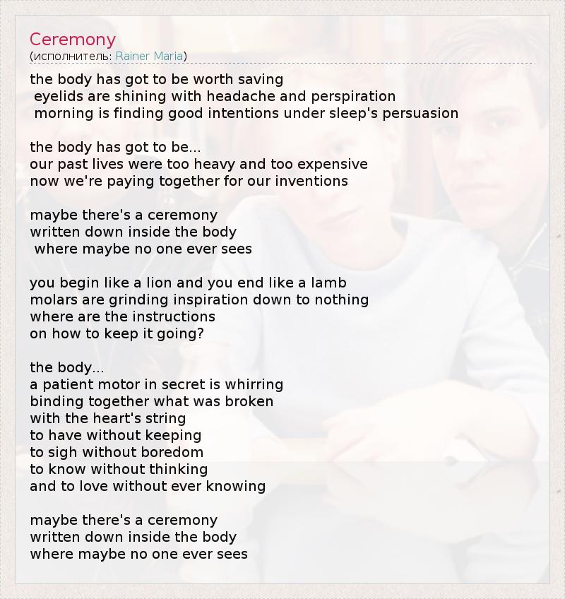 the body has got to be worth saving eyelids are shining with headache and perspiration morning is finding good intentions under sleep's persuasion the body has got to be... our past lives were too heavy and too expensive now we're paying together for our inventions maybe there's a ceremony written down inside the body where maybe no one ever sees you begin like a lion and you end like a lamb molars are grinding inspiration down to nothing where are the instructions on how to keep it going? the body... a patient motor in secret is whirring binding together what was broken with the heart's string to have without keeping to sigh without boredom to know without thinking and to love without ever knowing maybe there's a ceremony written down inside the body where maybe no one ever sees