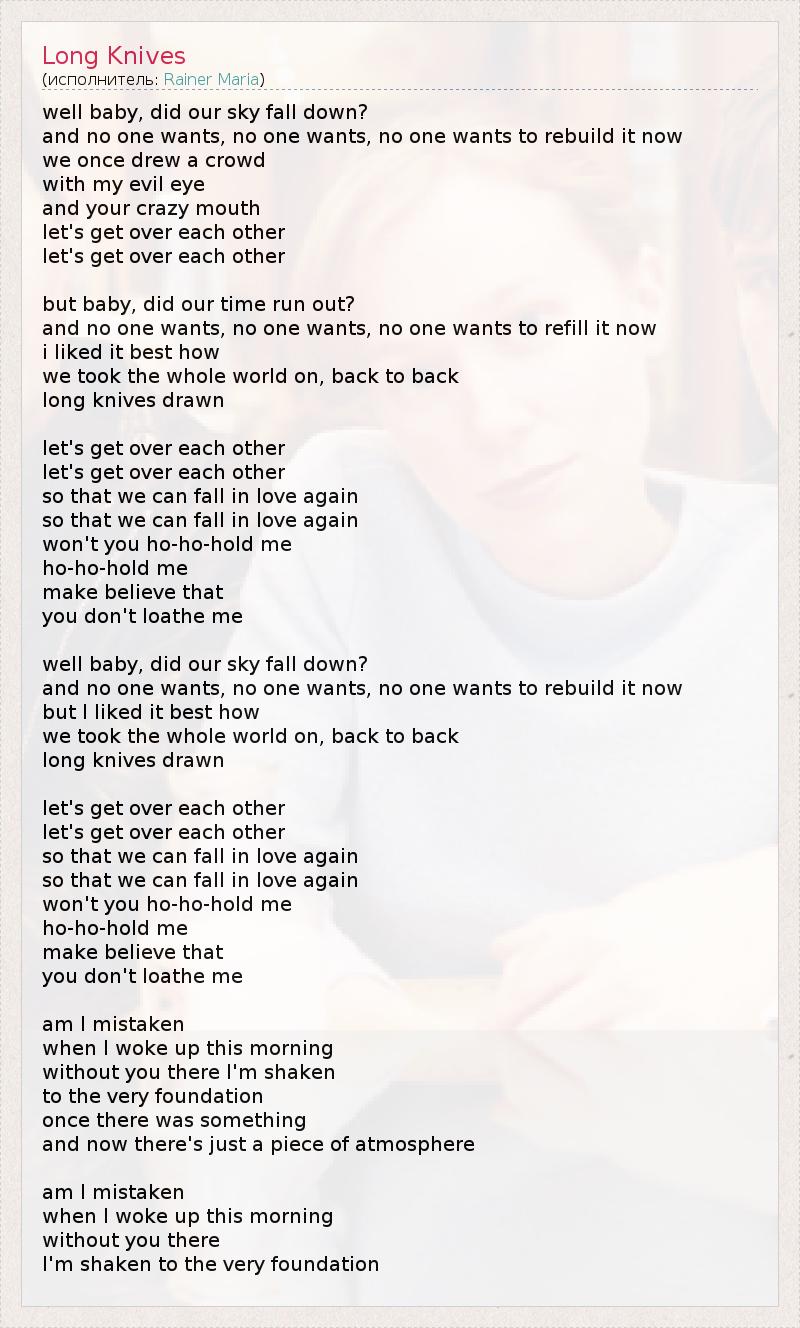well baby, did our sky fall down? and no one wants, no one wants, no one wants to rebuild it now we once drew a crowd with my evil eye and your crazy mouth let's get over each other let's get over each other but baby, did our time run out? and no one wants, no one wants, no one wants to refill it now i liked it best how we took the whole world on, back to back long knives drawn let's get over each other let's get over each other so that we can fall in love again so that we can fall in love again won't you ho-ho-hold me ho-ho-hold me make believe that you don't loathe me well baby, did our sky fall down? and no one wants, no one wants, no one wants to rebuild it now but I liked it best how we took the whole world on, back to back long knives drawn let's get over each other let's get over each other so that we can fall in love again so that we can fall in love again won't you ho-ho-hold me ho-ho-hold me make believe that you don't loathe me am I mistaken when I woke up this morning without you there I'm shaken to the very foundation once there was something and now there's just a piece of atmosphere am I mistaken when I woke up this morning without you there I'm shaken to the very foundation