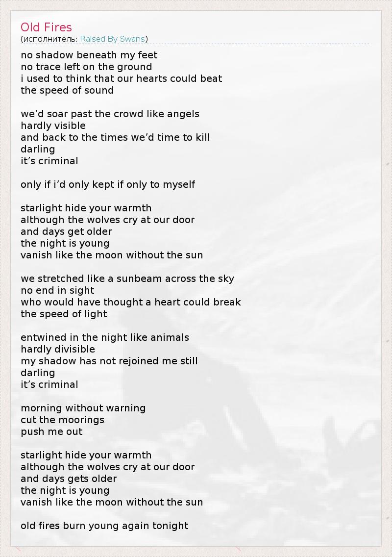 no shadow beneath my feet no trace left on the ground i used to think that our hearts could beat the speed of sound we’d soar past the crowd like angels hardly visible and back to the times we’d time to kill darling it’s criminal only if i’d only kept if only to myself starlight hide your warmth although the wolves cry at our door and days get older the night is young vanish like the moon without the sun we stretched like a sunbeam across the sky no end in sight who would have thought a heart could break the speed of light entwined in the night like animals hardly divisible my shadow has not rejoined me still darling it’s criminal morning without warning cut the moorings push me out starlight hide your warmth although the wolves cry at our door and days gets older the night is young vanish like the moon without the sun old fires burn young again tonight