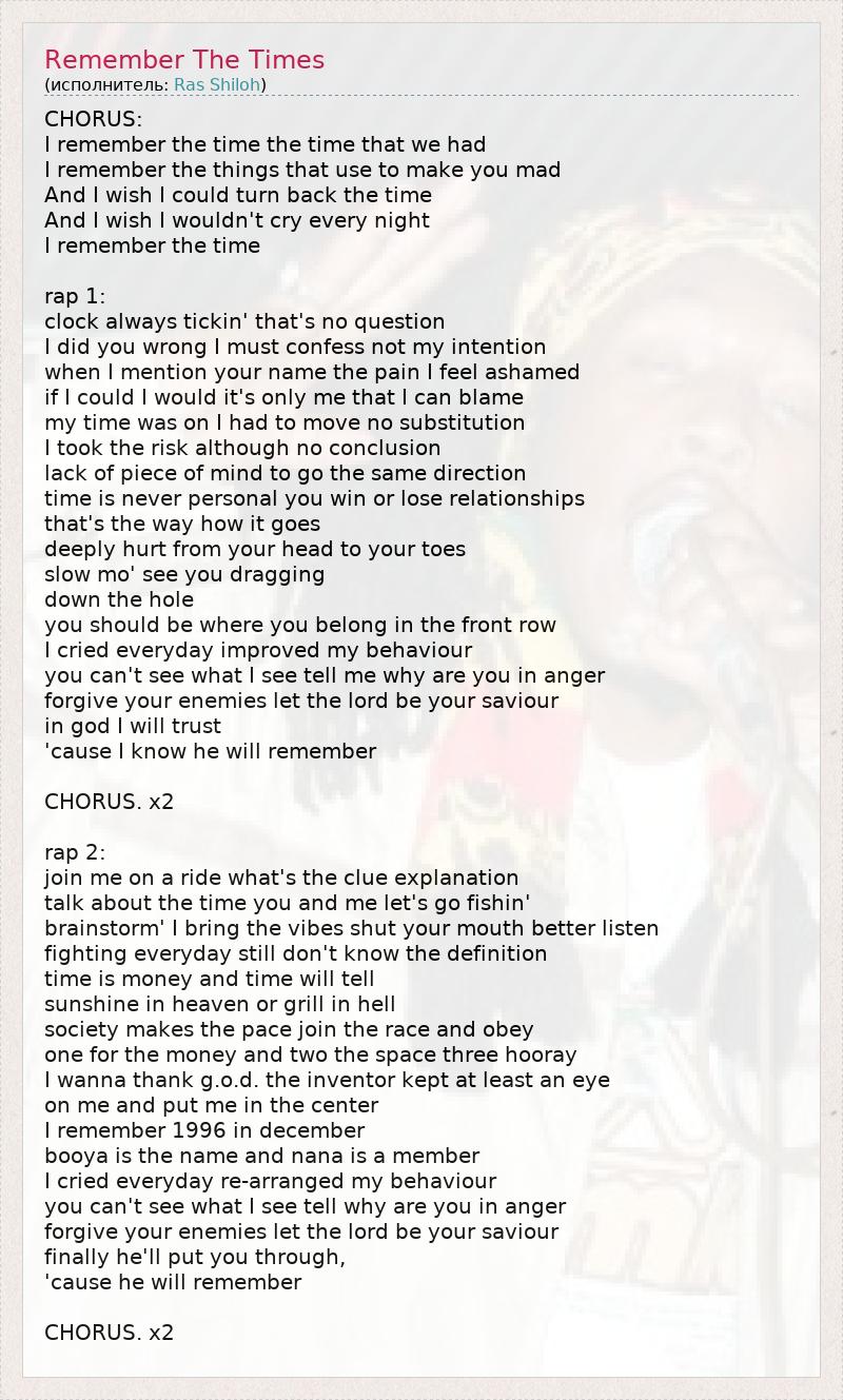 CHORUS: I remember the time the time that we had I remember the things that use to make you mad And I wish I could turn back the time And I wish I wouldn't cry every night I remember the time rap 1: clock always tickin' that's no question I did you wrong I must confess not my intention when I mention your name the pain I feel ashamed if I could I would it's only me that I can blame my time was on I had to move no substitution I took the risk although no conclusion lack of piece of mind to go the same direction time is never personal you win or lose relationships that's the way how it goes deeply hurt from your head to your toes slow mo' see you dragging down the hole you should be where you belong in the front row I cried everyday improved my behaviour you can't see what I see tell me why are you in anger forgive your enemies let the lord be your saviour in god I will trust 'cause I know he will remember CHORUS. x2 rap 2: join me on a ride what's the clue explanation talk about the time you and me let's go fishin' brainstorm' I bring the vibes shut your mouth better listen fighting everyday still don't know the definition time is money and time will tell sunshine in heaven or grill in hell society makes the pace join the race and obey one for the money and two the space three hooray I wanna thank g.o.d. the inventor kept at least an eye on me and put me in the center I remember 1996 in december booya is the name and nana is a member I cried everyday re-arranged my behaviour you can't see what I see tell why are you in anger forgive your enemies let the lord be your saviour finally he'll put you through, 'cause he will remember CHORUS. x2