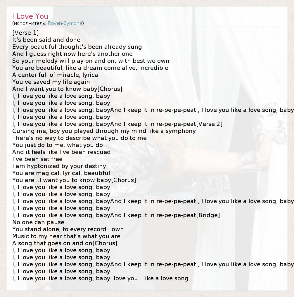 [Verse 1] It's been said and done Every beautiful thought's been already sung And I guess right now here's another one So your melody will play on and on, with best we own You are beautiful, like a dream come alive, incredible A center full of miracle, lyrical You've saved my life again And I want you to know baby[Chorus] I, I love you like a love song, baby I, I love you like a love song, baby I, I love you like a love song, babyAnd I keep it in re-pe-pe-peatI, I love you like a love song, baby I, I love you like a love song, baby I, I love you like a love song, babyAnd I keep it in re-pe-pe-peat[Verse 2] Cursing me, boy you played through my mind like a symphony There's no way to describe what you do to me You just do to me, what you do And it feels like I've been rescued I've been set free I am hyptonized by your destiny You are magical, lyrical, beautiful You are...I want you to know baby[Chorus] I, I love you like a love song, baby I, I love you like a love song, baby I, I love you like a love song, babyAnd I keep it in re-pe-pe-peatI, I love you like a love song, baby I, I love you like a love song, baby I, I love you like a love song, babyAnd I keep it in re-pe-pe-peat[Bridge] No one can pause You stand alone, to every record I own Music to my hear that's what you are A song that goes on and on[Chorus] I, I love you like a love song, baby I, I love you like a love song, baby I, I love you like a love song, babyAnd I keep it in re-pe-pe-peatI, I love you like a love song, baby I, I love you like a love song, baby I, I love you like a love song, babyI love you...like a love song...
