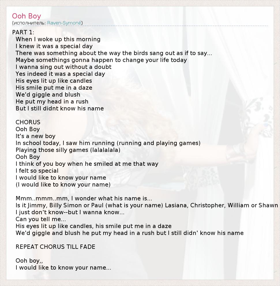 PART 1: When I woke up this morning I knew it was a special day There was something about the way the birds sang out as if to say... Maybe somethings gonna happen to change your life today I wanna sing out without a doubt Yes indeed it was a special day His eyes lit up like candles His smile put me in a daze We'd giggle and blush He put my head in a rush But I still didnt know his name CHORUS Ooh Boy It's a new boy In school today, I saw him running (running and playing games) Playing those silly games (lalalalala) Ooh Boy I think of you boy when he smiled at me that way I felt so special I would like to know your name (I would like to know your name) Mmm..mmm..mm, I wonder what his name is... Is it Jimmy, Billy Simon or Paul (what is your name) Lasiana, Christopher, William or Shawn I just don't know--but I wanna know... Can you tell me... His eyes lit up like candles, his smile put me in a daze We'd giggle and blush he put my head in a rush but I still didn' know his name REPEAT CHORUS TILL FADE Ooh boy,, I would like to know your name...
