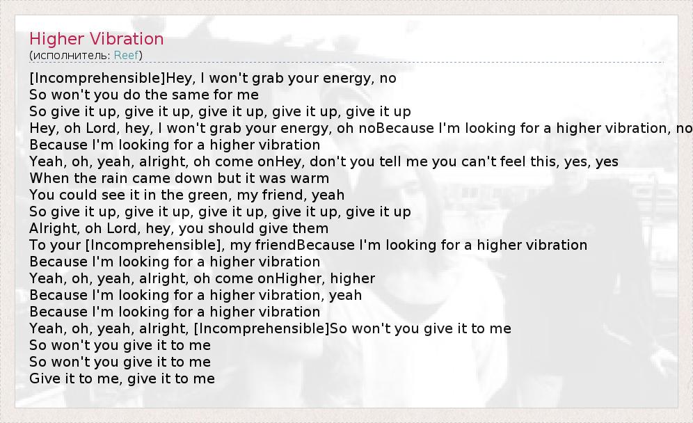 [Incomprehensible]Hey, I won't grab your energy, no So won't you do the same for me So give it up, give it up, give it up, give it up, give it up Hey, oh Lord, hey, I won't grab your energy, oh noBecause I'm looking for a higher vibration, no Because I'm looking for a higher vibration Yeah, oh, yeah, alright, oh come onHey, don't you tell me you can't feel this, yes, yes When the rain came down but it was warm You could see it in the green, my friend, yeah So give it up, give it up, give it up, give it up, give it up Alright, oh Lord, hey, you should give them To your [Incomprehensible], my friendBecause I'm looking for a higher vibration Because I'm looking for a higher vibration Yeah, oh, yeah, alright, oh come onHigher, higher Because I'm looking for a higher vibration, yeah Because I'm looking for a higher vibration Yeah, oh, yeah, alright, [Incomprehensible]So won't you give it to me So won't you give it to me So won't you give it to me Give it to me, give it to me