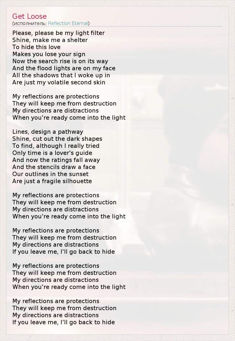 Please, please be my light filter Shine, make me a shelter To hide this love Makes you lose your sign Now the search rise is on its way And the flood lights are on my face All the shadows that I woke up in Are just my volatile second skin My reflections are protections They will keep me from destruction My directions are distractions When you're ready come into the light Lines, design a pathway Shine, cut out the dark shapes To find, although I really tried Only time is a lover's guide And now the ratings fall away And the stencils draw a face Our outlines in the sunset Are just a fragile silhouette My reflections are protections They will keep me from destruction My directions are distractions When you're ready come into the light My reflections are protections They will keep me from destruction My directions are distractions If you leave me, I'll go back to hide My reflections are protections They will keep me from destruction My directions are distractions When you're ready come into the light My reflections are protections They will keep me from destruction My directions are distractions If you leave me, I'll go back to hide
