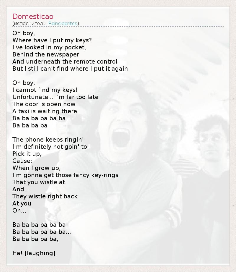 Oh boy, Where have I put my keys? I've looked in my pocket, Behind the newspaper And underneath the remote control But I still can't find where I put it again Oh boy, I cannot find my keys! Unfortunate... I'm far too late The door is open now A taxi is waiting there Ba ba ba ba ba ba Ba ba ba ba The phone keeps ringin' I'm definitely not goin' to Pick it up, Cause: When I grow up, I'm gonna get those fancy key-rings That you wistle at And... They wistle right back At you Oh... Ba ba ba ba ba ba Ba ba ba ba ba ba... Ba ba ba ba ba, Ha! [laughing]