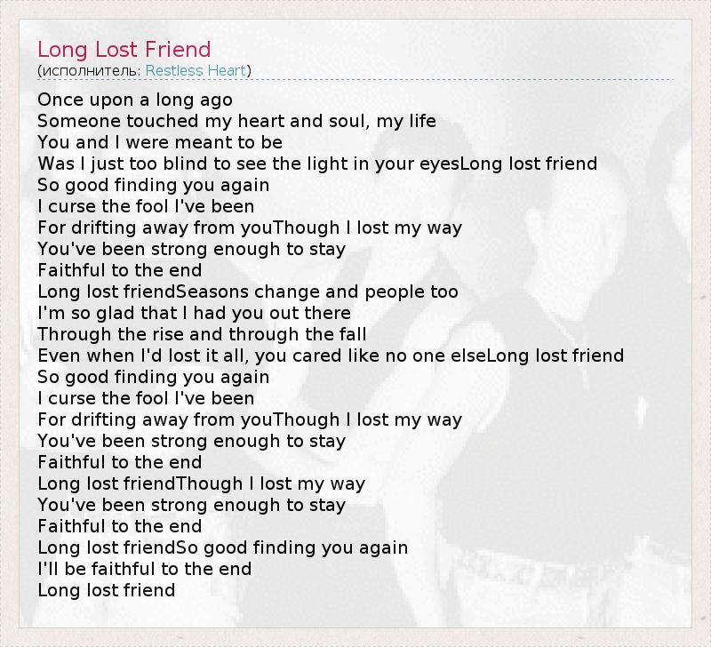 Even when I'd lost it all, you cared like no one elseLong lost friend