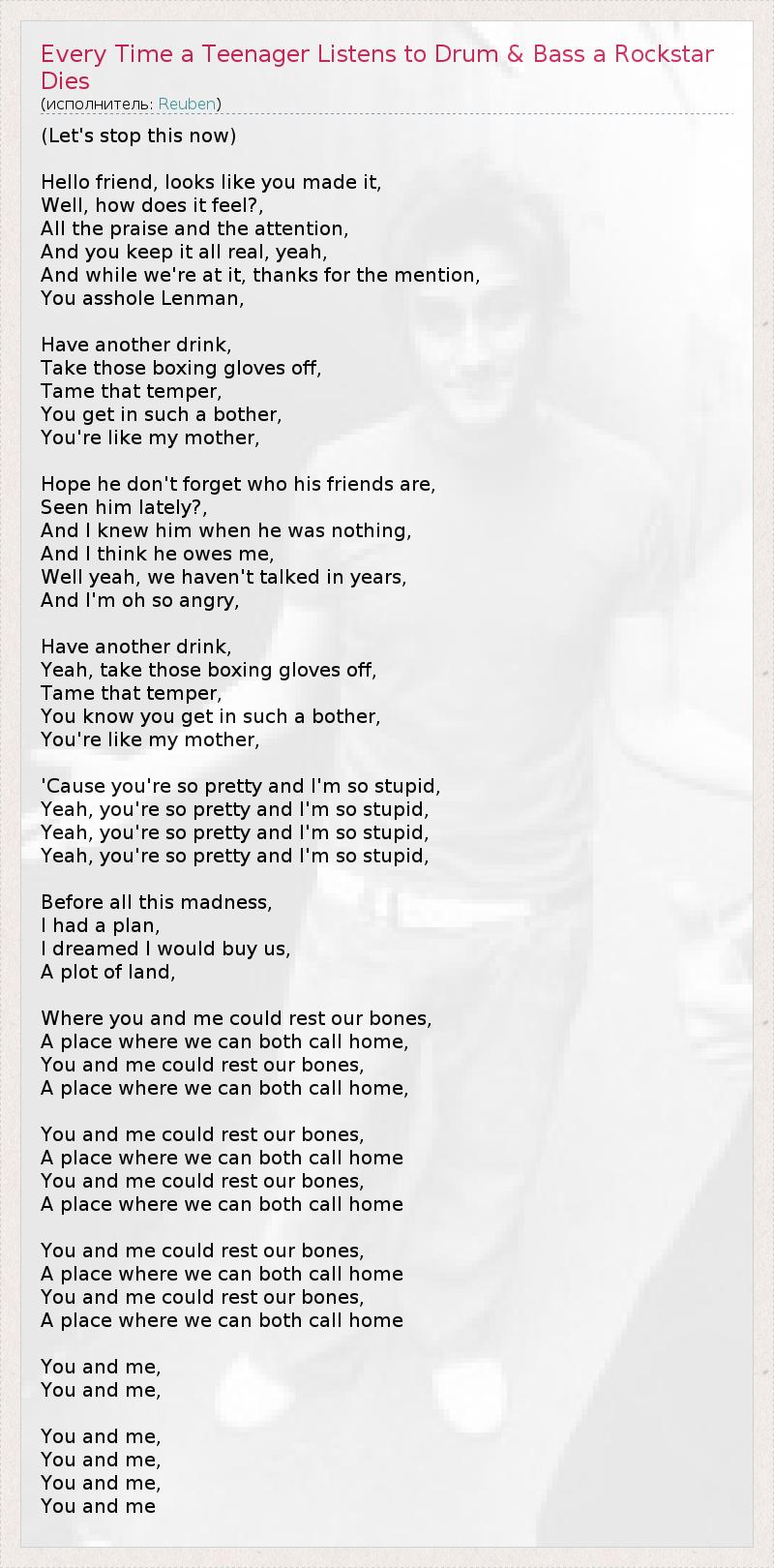 (Let's stop this now) Hello friend, looks like you made it, Well, how does it feel?, All the praise and the attention, And you keep it all real, yeah, And while we're at it, thanks for the mention, You asshole Lenman, Have another drink, Take those boxing gloves off, Tame that temper, You get in such a bother, You're like my mother, Hope he don't forget who his friends are, Seen him lately?, And I knew him when he was nothing, And I think he owes me, Well yeah, we haven't talked in years, And I'm oh so angry, Have another drink, Yeah, take those boxing gloves off, Tame that temper, You know you get in such a bother, You're like my mother, 'Cause you're so pretty and I'm so stupid, Yeah, you're so pretty and I'm so stupid, Yeah, you're so pretty and I'm so stupid, Yeah, you're so pretty and I'm so stupid, Before all this madness, I had a plan, I dreamed I would buy us, A plot of land, Where you and me could rest our bones, A place where we can both call home, You and me could rest our bones, A place where we can both call home, You and me could rest our bones, A place where we can both call home You and me could rest our bones, A place where we can both call home You and me could rest our bones, A place where we can both call home You and me could rest our bones, A place where we can both call home You and me, You and me, You and me, You and me, You and me, You and me