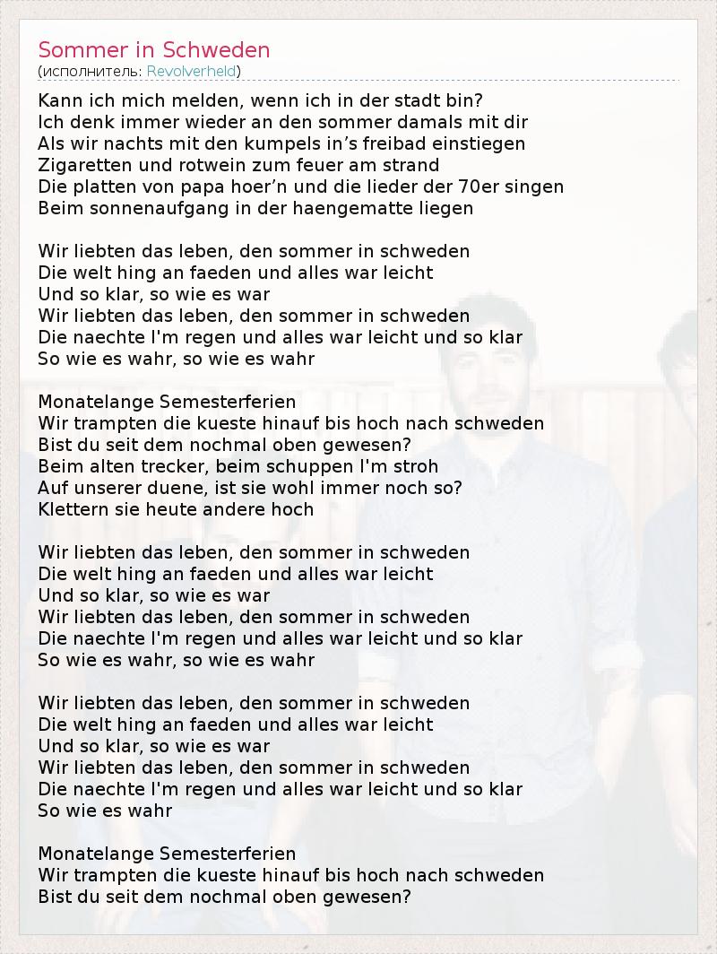 Kann ich mich melden, wenn ich in der stadt bin? Ich denk immer wieder an den sommer damals mit dir Als wir nachts mit den kumpels in’s freibad einstiegen Zigaretten und rotwein zum feuer am strand Die platten von papa hoer’n und die lieder der 70er singen Beim sonnenaufgang in der haengematte liegen Wir liebten das leben, den sommer in schweden Die welt hing an faeden und alles war leicht Und so klar, so wie es war Wir liebten das leben, den sommer in schweden Die naechte I'm regen und alles war leicht und so klar So wie es wahr, so wie es wahr Monatelange Semesterferien Wir trampten die kueste hinauf bis hoch nach schweden Bist du seit dem nochmal oben gewesen? Beim alten trecker, beim schuppen I'm stroh Auf unserer duene, ist sie wohl immer noch so? Klettern sie heute andere hoch Wir liebten das leben, den sommer in schweden Die welt hing an faeden und alles war leicht Und so klar, so wie es war Wir liebten das leben, den sommer in schweden Die naechte I'm regen und alles war leicht und so klar So wie es wahr, so wie es wahr Wir liebten das leben, den sommer in schweden Die welt hing an faeden und alles war leicht Und so klar, so wie es war Wir liebten das leben, den sommer in schweden Die naechte I'm regen und alles war leicht und so klar So wie es wahr Monatelange Semesterferien Wir trampten die kueste hinauf bis hoch nach schweden Bist du seit dem nochmal oben gewesen?