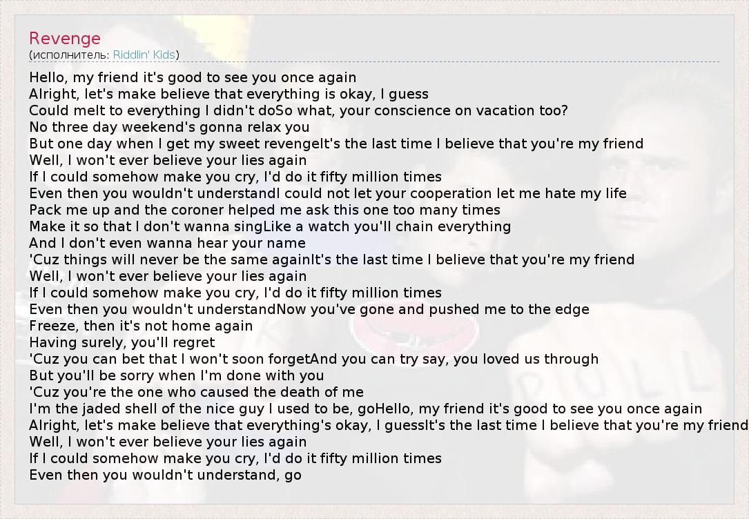 But one day when I get my sweet revengeIt's the last time I believe that you're my friend