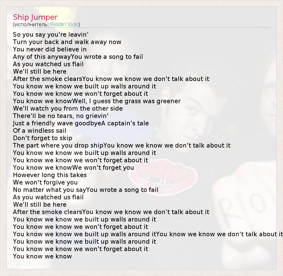 So you say you're leavin' Turn your back and walk away now You never did believe in Any of this anywayYou wrote a song to fail As you watched us flail We'll still be here After the smoke clearsYou know we know we don't talk about it You know we know we built up walls around it You know we know we won't forget about it You know we knowWell, I guess the grass was greener We'll watch you from the other side There'll be no tears, no grievin' Just a friendly wave goodbyeA captain's tale Of a windless sail Don't forget to skip The part where you drop shipYou know we know we don't talk about it You know we know we built up walls around it You know we know we won't forget about it You know we knowWe won't forget you However long this takes We won't forgive you No matter what you sayYou wrote a song to fail As you watched us flail We'll still be here After the smoke clearsYou know we know we don't talk about it You know we know we built up walls around it You know we know we won't forget about it You know we know we built up walls around itYou know we know we don't talk about it You know we know we built up walls around it You know we know we won't forget about it You know we know