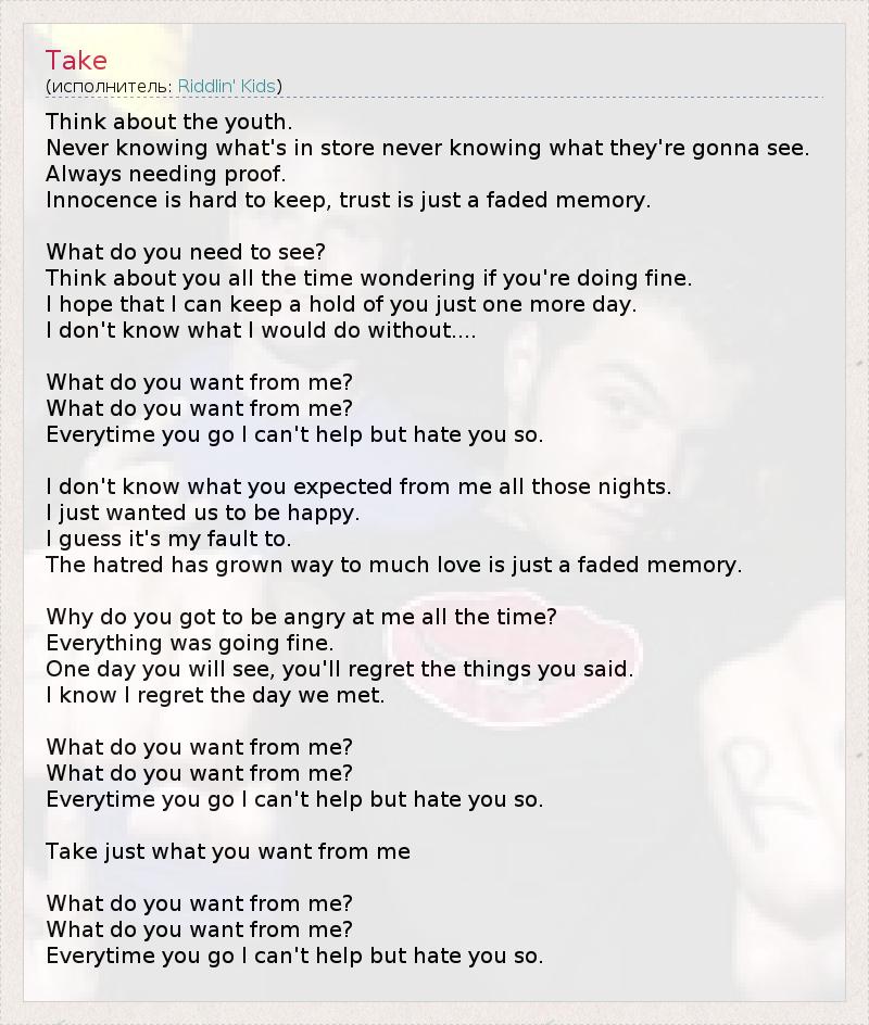 Think about the youth. Never knowing what's in store never knowing what they're gonna see. Always needing proof. Innocence is hard to keep, trust is just a faded memory. What do you need to see? Think about you all the time wondering if you're doing fine. I hope that I can keep a hold of you just one more day. I don't know what I would do without.... What do you want from me? What do you want from me? Everytime you go I can't help but hate you so. I don't know what you expected from me all those nights. I just wanted us to be happy. I guess it's my fault to. The hatred has grown way to much love is just a faded memory. Why do you got to be angry at me all the time? Everything was going fine. One day you will see, you'll regret the things you said. I know I regret the day we met. What do you want from me? What do you want from me? Everytime you go I can't help but hate you so. Take just what you want from me What do you want from me? What do you want from me? Everytime you go I can't help but hate you so.