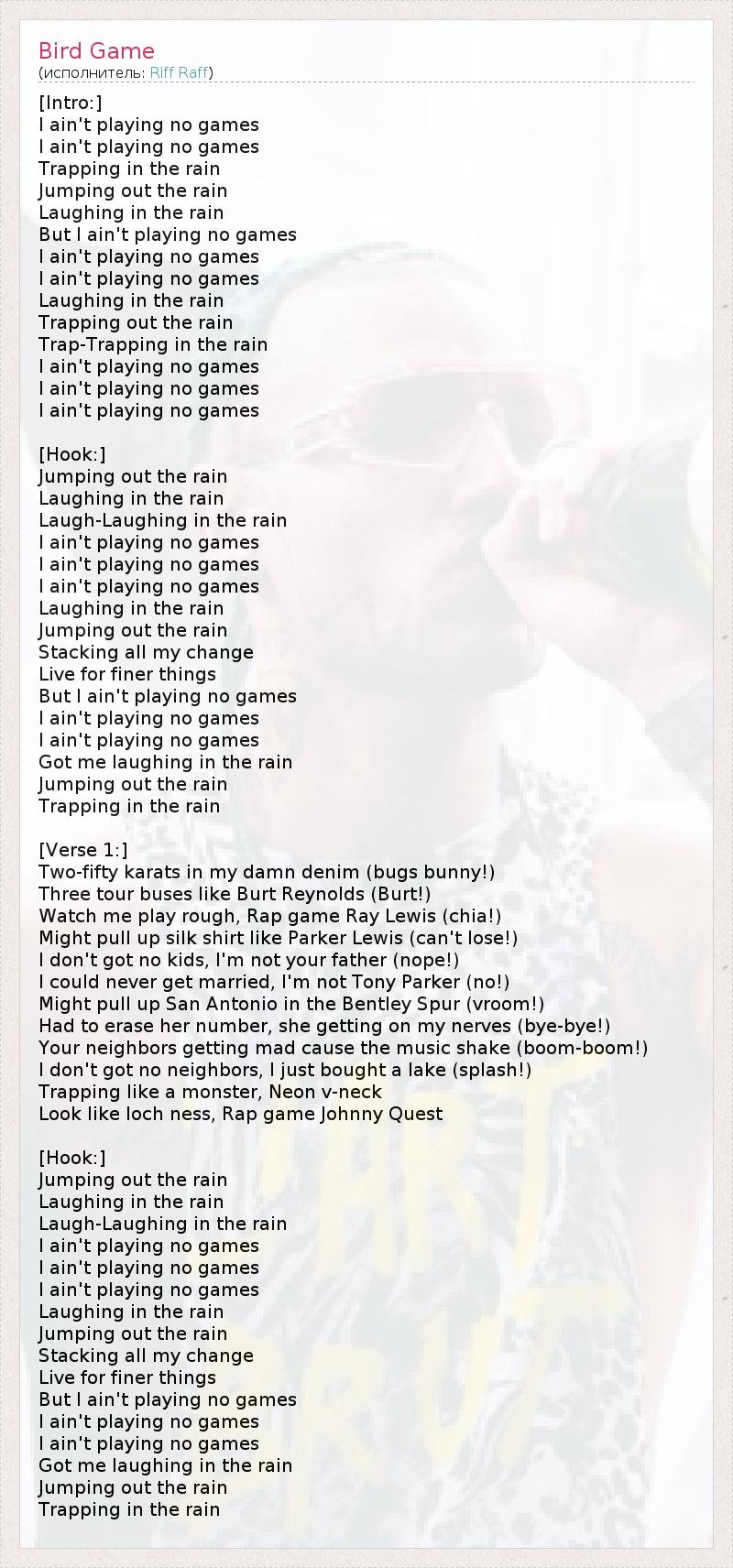 [Intro:] I ain't playing no games I ain't playing no games Trapping in the rain Jumping out the rain Laughing in the rain But I ain't playing no games I ain't playing no games I ain't playing no games Laughing in the rain Trapping out the rain Trap-Trapping in the rain I ain't playing no games I ain't playing no games I ain't playing no games [Hook:] Jumping out the rain Laughing in the rain Laugh-Laughing in the rain I ain't playing no games I ain't playing no games I ain't playing no games Laughing in the rain Jumping out the rain Stacking all my change Live for finer things But I ain't playing no games I ain't playing no games I ain't playing no games Got me laughing in the rain Jumping out the rain Trapping in the rain [Verse 1:] Two-fifty karats in my damn denim (bugs bunny!) Three tour buses like Burt Reynolds (Burt!) Watch me play rough, Rap game Ray Lewis (chia!) Might pull up silk shirt like Parker Lewis (can't lose!) I don't got no kids, I'm not your father (nope!) I could never get married, I'm not Tony Parker (no!) Might pull up San Antonio in the Bentley Spur (vroom!) Had to erase her number, she getting on my nerves (bye-bye!) Your neighbors getting mad cause the music shake (boom-boom!) I don't got no neighbors, I just bought a lake (splash!) Trapping like a monster, Neon v-neck Look like loch ness, Rap game Johnny Quest [Hook:] Jumping out the rain Laughing in the rain Laugh-Laughing in the rain I ain't playing no games I ain't playing no games I ain't playing no games Laughing in the rain Jumping out the rain Stacking all my change Live for finer things But I ain't playing no games I ain't playing no games I ain't playing no games Got me laughing in the rain Jumping out the rain Trapping in the rain