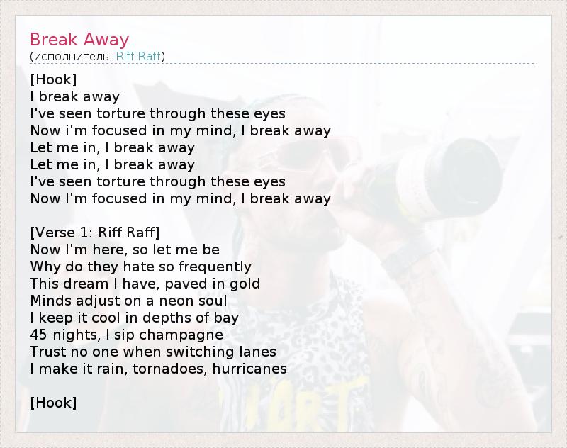 [Hook] I break away I've seen torture through these eyes Now i'm focused in my mind, I break away Let me in, I break away Let me in, I break away I've seen torture through these eyes Now I'm focused in my mind, I break away [Verse 1: Riff Raff] Now I'm here, so let me be Why do they hate so frequently This dream I have, paved in gold Minds adjust on a neon soul I keep it cool in depths of bay 45 nights, I sip champagne Trust no one when switching lanes I make it rain, tornadoes, hurricanes [Hook]