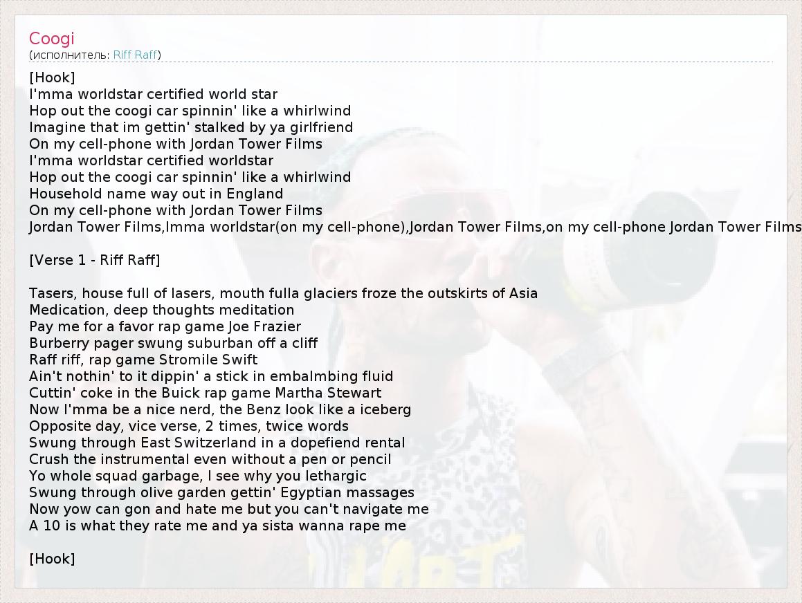 [Hook] I'mma worldstar certified world star Hop out the coogi car spinnin' like a whirlwind Imagine that im gettin' stalked by ya girlfriend On my cell-phone with Jordan Tower Films I'mma worldstar certified worldstar Hop out the coogi car spinnin' like a whirlwind Household name way out in England On my cell-phone with Jordan Tower Films Jordan Tower Films,Imma worldstar(on my cell-phone),Jordan Tower Films,on my cell-phone Jordan Tower Films [Verse 1 - Riff Raff] Tasers, house full of lasers, mouth fulla glaciers froze the outskirts of Asia Medication, deep thoughts meditation Pay me for a favor rap game Joe Frazier Burberry pager swung suburban off a cliff Raff riff, rap game Stromile Swift Ain't nothin' to it dippin' a stick in embalmbing fluid Cuttin' coke in the Buick rap game Martha Stewart Now I'mma be a nice nerd, the Benz look like a iceberg Opposite day, vice verse, 2 times, twice words Swung through East Switzerland in a dopefiend rental Crush the instrumental even without a pen or pencil Yo whole squad garbage, I see why you lethargic Swung through olive garden gettin' Egyptian massages Now yow can gon and hate me but you can't navigate me A 10 is what they rate me and ya sista wanna rape me [Hook]