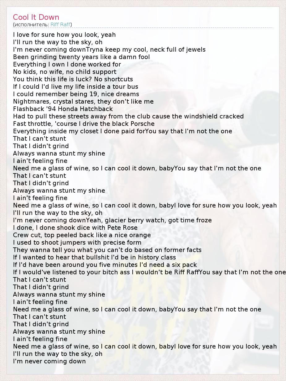 I love for sure how you look, yeah I'll run the way to the sky, oh I'm never coming downTryna keep my cool, neck full of jewels Been grinding twenty years like a damn fool Everything I own I done worked for No kids, no wife, no child support You think this life is luck? No shortcuts If I could I'd live my life inside a tour bus I could remember being 19, nice dreams Nightmares, crystal stares, they don't like me Flashback '94 Honda Hatchback Had to pull these streets away from the club cause the windshield cracked Fast throttle, 'course I drive the black Porsche Everything inside my closet I done paid forYou say that I'm not the one That I can't stunt That I didn't grind Always wanna stunt my shine I ain't feeling fine Need me a glass of wine, so I can cool it down, babyYou say that I'm not the one That I can't stunt That I didn't grind Always wanna stunt my shine I ain't feeling fine Need me a glass of wine, so I can cool it down, babyI love for sure how you look, yeah I'll run the way to the sky, oh I'm never coming downYeah, glacier berry watch, got time froze I done, I done shook dice with Pete Rose Crew cut, top peeled back like a nice orange I used to shoot jumpers with precise form They wanna tell you what you can't do based on former facts If I wanted to hear that bullshit I'd be in history class If I'd have been around you five minutes I'd need a six pack If I would've listened to your bitch ass I wouldn't be Riff RaffYou say that I'm not the one That I can't stunt That I didn't grind Always wanna stunt my shine I ain't feeling fine Need me a glass of wine, so I can cool it down, babyYou say that I'm not the one That I can't stunt That I didn't grind Always wanna stunt my shine I ain't feeling fine Need me a glass of wine, so I can cool it down, babyI love for sure how you look, yeah I'll run the way to the sky, oh I'm never coming down
