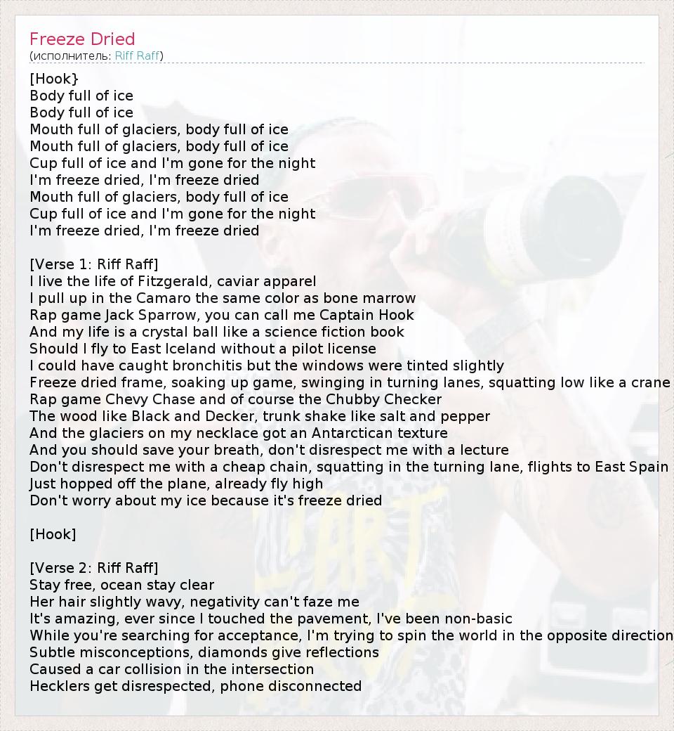 [Hook} Body full of ice Body full of ice Mouth full of glaciers, body full of ice Mouth full of glaciers, body full of ice Cup full of ice and I'm gone for the night I'm freeze dried, I'm freeze dried Mouth full of glaciers, body full of ice Cup full of ice and I'm gone for the night I'm freeze dried, I'm freeze dried [Verse 1: Riff Raff] I live the life of Fitzgerald, caviar apparel I pull up in the Camaro the same color as bone marrow Rap game Jack Sparrow, you can call me Captain Hook And my life is a crystal ball like a science fiction book Should I fly to East Iceland without a pilot license I could have caught bronchitis but the windows were tinted slightly Freeze dried frame, soaking up game, swinging in turning lanes, squatting low like a crane Rap game Chevy Chase and of course the Chubby Checker The wood like Black and Decker, trunk shake like salt and pepper And the glaciers on my necklace got an Antarctican texture And you should save your breath, don't disrespect me with a lecture Don't disrespect me with a cheap chain, squatting in the turning lane, flights to East Spain Just hopped off the plane, already fly high Don't worry about my ice because it's freeze dried [Hook] [Verse 2: Riff Raff] Stay free, ocean stay clear Her hair slightly wavy, negativity can't faze me It's amazing, ever since I touched the pavement, I've been non-basic While you're searching for acceptance, I'm trying to spin the world in the opposite direction Subtle misconceptions, diamonds give reflections Caused a car collision in the intersection Hecklers get disrespected, phone disconnected