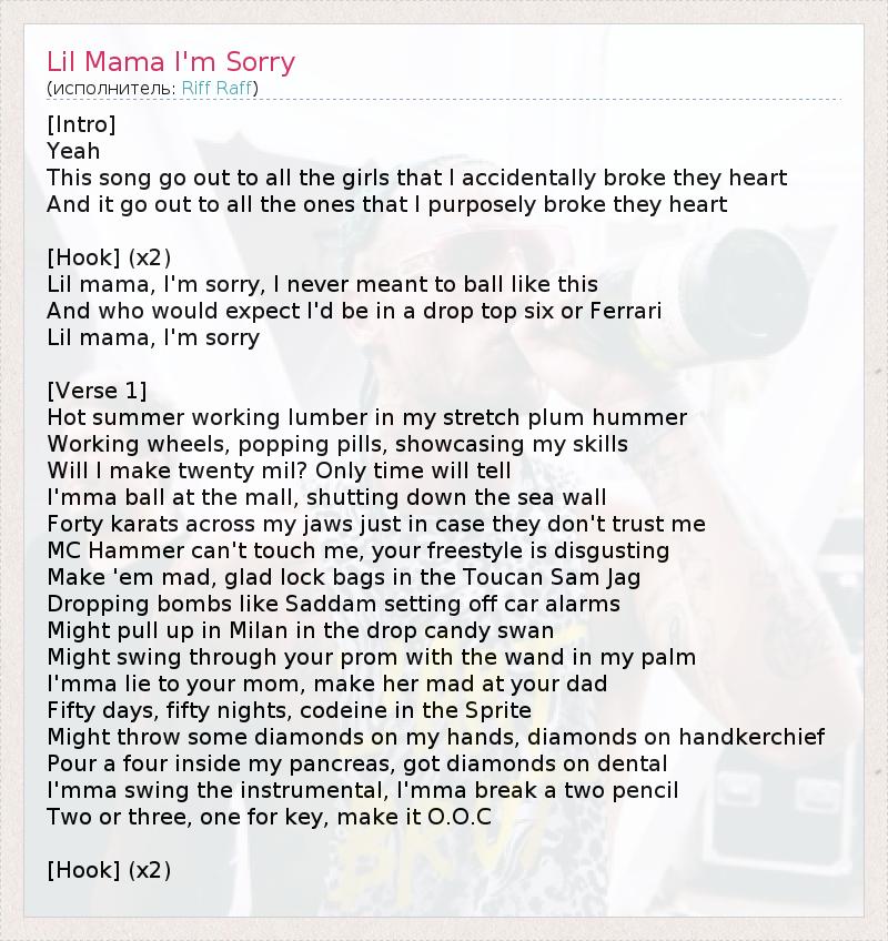 [Intro] Yeah This song go out to all the girls that I accidentally broke they heart And it go out to all the ones that I purposely broke they heart [Hook] (x2) Lil mama, I'm sorry, I never meant to ball like this And who would expect I'd be in a drop top six or Ferrari Lil mama, I'm sorry [Verse 1] Hot summer working lumber in my stretch plum hummer Working wheels, popping pills, showcasing my skills Will I make twenty mil? Only time will tell I'mma ball at the mall, shutting down the sea wall Forty karats across my jaws just in case they don't trust me MC Hammer can't touch me, your freestyle is disgusting Make 'em mad, glad lock bags in the Toucan Sam Jag Dropping bombs like Saddam setting off car alarms Might pull up in Milan in the drop candy swan Might swing through your prom with the wand in my palm I'mma lie to your mom, make her mad at your dad Fifty days, fifty nights, codeine in the Sprite Might throw some diamonds on my hands, diamonds on handkerchief Pour a four inside my pancreas, got diamonds on dental I'mma swing the instrumental, I'mma break a two pencil Two or three, one for key, make it O.O.C [Hook] (x2)