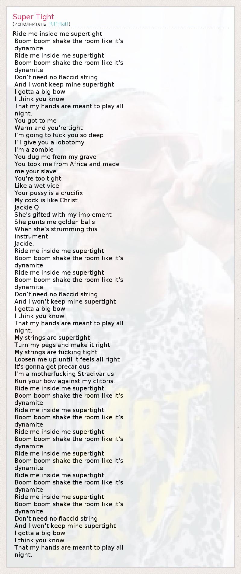 Ride me inside me supertight Boom boom shake the room like it's dynamite Ride me inside me supertight Boom boom shake the room like it's dynamite Don't need no flaccid string And I wont keep mine supertight I gotta a big bow I think you know That my hands are meant to play all night. You got to me Warm and you're tight I'm going to fuck you so deep I'll give you a lobotomy I'm a zombie You dug me from my grave You took me from Africa and made me your slave You're too tight Like a wet vice Your pussy is a crucifix My cock is like Christ Jackie Q She's gifted with my implement She punts me golden balls When she's strumming this instrument Jackie. Ride me inside me supertight Boom boom shake the room like it's dynamite Ride me inside me supertight Boom boom shake the room like it's dynamite Don't need no flaccid string And I won't keep mine supertight I gotta a big bow I think you know That my hands are meant to play all night. My strings are supertight Turn my pegs and make it right My strings are fucking tight Loosen me up until it feels all right It's gonna get precarious I'm a motherfucking Stradivarius Run your bow against my clitoris. Ride me inside me supertight Boom boom shake the room like it's dynamite Ride me inside me supertight Boom boom shake the room like it's dynamite Ride me inside me supertight Boom boom shake the room like it's dynamite Ride me inside me supertight Boom boom shake the room like it's dynamite Ride me inside me supertight Boom boom shake the room like it's dynamite Ride me inside me supertight Boom boom shake the room like it's dynamite Don't need no flaccid string And I won't keep mine supertight I gotta a big bow I think you know That my hands are meant to play all night.