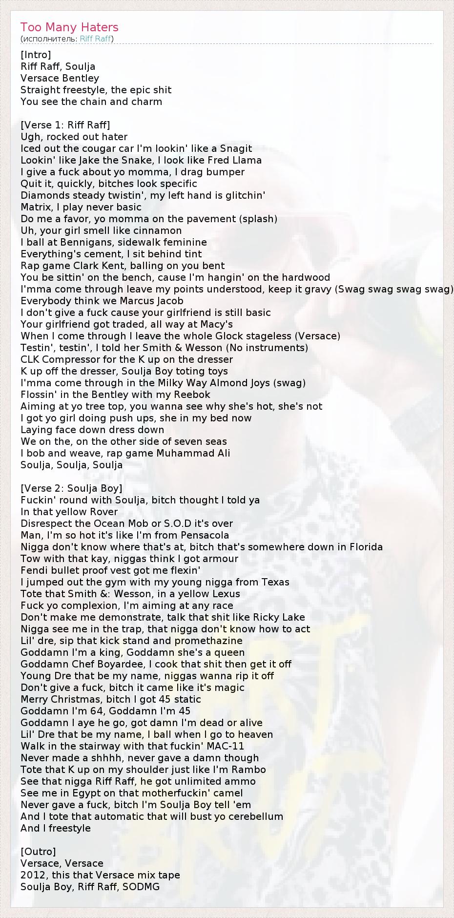 [Intro] Riff Raff, Soulja Versace Bentley Straight freestyle, the epic shit You see the chain and charm [Verse 1: Riff Raff] Ugh, rocked out hater Iced out the cougar car I'm lookin' like a Snagit Lookin' like Jake the Snake, I look like Fred Llama I give a fuck about yo momma, I drag bumper Quit it, quickly, bitches look specific Diamonds steady twistin', my left hand is glitchin' Matrix, I play never basic Do me a favor, yo momma on the pavement (splash) Uh, your girl smell like cinnamon I ball at Bennigans, sidewalk feminine Everything's cement, I sit behind tint Rap game Clark Kent, balling on you bent You be sittin' on the bench, cause I'm hangin' on the hardwood I'mma come through leave my points understood, keep it gravy (Swag swag swag swag) Everybody think we Marcus Jacob I don't give a fuck cause your girlfriend is still basic Your girlfriend got traded, all way at Macy's When I come through I leave the whole Glock stageless (Versace) Testin', testin', I told her Smith & Wesson (No instruments) CLK Compressor for the K up on the dresser K up off the dresser, Soulja Boy toting toys I'mma come through in the Milky Way Almond Joys (swag) Flossin' in the Bentley with my Reebok Aiming at yo tree top, you wanna see why she's hot, she's not I got yo girl doing push ups, she in my bed now Laying face down dress down We on the, on the other side of seven seas I bob and weave, rap game Muhammad Ali Soulja, Soulja, Soulja [Verse 2: Soulja Boy] Fuckin' round with Soulja, bitch thought I told ya In that yellow Rover Disrespect the Ocean Mob or S.O.D it's over Man, I'm so hot it's like I'm from Pensacola Nigga don't know where that's at, bitch that's somewhere down in Florida Tow with that kay, niggas think I got armour Fendi bullet proof vest got me flexin' I jumped out the gym with my young nigga from Texas Tote that Smith &: Wesson, in a yellow Lexus Fuck yo complexion, I'm aiming at any race Don't make me demonstrate, talk that shit like Ricky Lake Nigga see me in the trap, that nigga don't know how to act Lil' dre, sip that kick stand and promethazine Goddamn I'm a king, Goddamn she's a queen Goddamn Chef Boyardee, I cook that shit then get it off Young Dre that be my name, niggas wanna rip it off Don't give a fuck, bitch it came like it's magic Merry Christmas, bitch I got 45 static Goddamn I'm 64, Goddamn I'm 45 Goddamn I aye he go, got damn I'm dead or alive Lil' Dre that be my name, I ball when I go to heaven Walk in the stairway with that fuckin' MAC-11 Never made a shhhh, never gave a damn though Tote that K up on my shoulder just like I'm Rambo See that nigga Riff Raff, he got unlimited ammo See me in Egypt on that motherfuckin' camel Never gave a fuck, bitch I'm Soulja Boy tell 'em And I tote that automatic that will bust yo cerebellum And I freestyle [Outro] Versace, Versace 2012, this that Versace mix tape Soulja Boy, Riff Raff, SODMG
