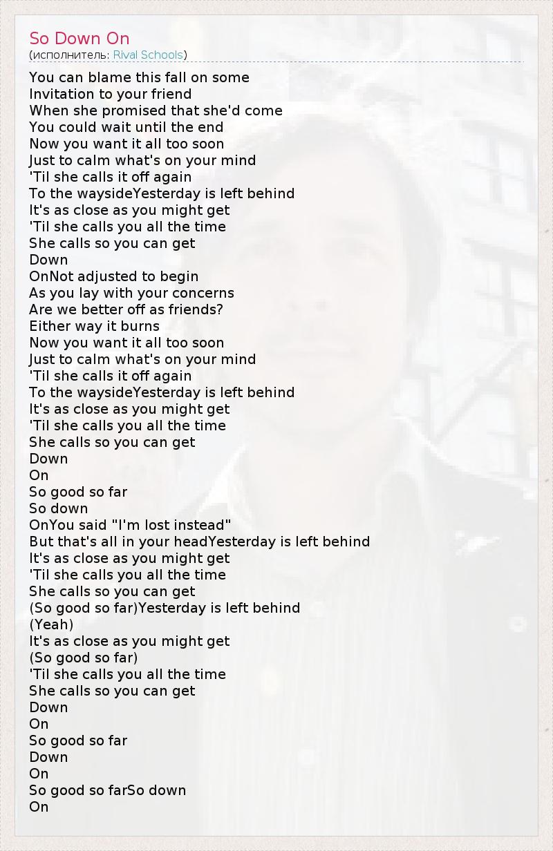 You can blame this fall on some Invitation to your friend When she promised that she'd come You could wait until the end Now you want it all too soon Just to calm what's on your mind 'Til she calls it off again To the waysideYesterday is left behind It's as close as you might get 'Til she calls you all the time She calls so you can get Down OnNot adjusted to begin As you lay with your concerns Are we better off as friends? Either way it burns Now you want it all too soon Just to calm what's on your mind 'Til she calls it off again To the waysideYesterday is left behind It's as close as you might get 'Til she calls you all the time She calls so you can get Down On So good so far So down OnYou said "I'm lost instead" But that's all in your headYesterday is left behind It's as close as you might get 'Til she calls you all the time She calls so you can get (So good so far)Yesterday is left behind (Yeah) It's as close as you might get (So good so far) 'Til she calls you all the time She calls so you can get Down On So good so far Down On So good so farSo down On