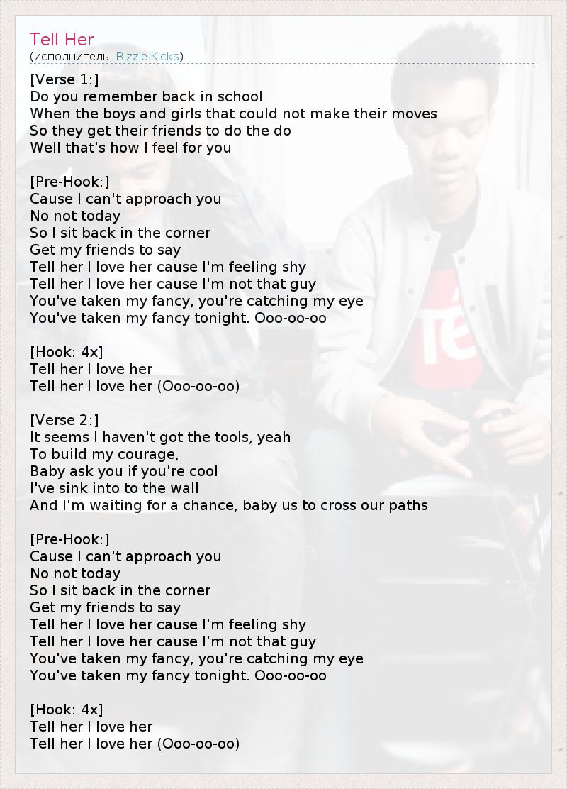 [Verse 1:] Do you remember back in school When the boys and girls that could not make their moves So they get their friends to do the do Well that's how I feel for you [Pre-Hook:] Cause I can't approach you No not today So I sit back in the corner Get my friends to say Tell her I love her cause I'm feeling shy Tell her I love her cause I'm not that guy You've taken my fancy, you're catching my eye You've taken my fancy tonight. Ooo-oo-oo [Hook: 4x] Tell her I love her Tell her I love her (Ooo-oo-oo) [Verse 2:] It seems I haven't got the tools, yeah To build my courage, Baby ask you if you're cool I've sink into to the wall And I'm waiting for a chance, baby us to cross our paths [Pre-Hook:] Cause I can't approach you No not today So I sit back in the corner Get my friends to say Tell her I love her cause I'm feeling shy Tell her I love her cause I'm not that guy You've taken my fancy, you're catching my eye You've taken my fancy tonight. Ooo-oo-oo [Hook: 4x] Tell her I love her Tell her I love her (Ooo-oo-oo)