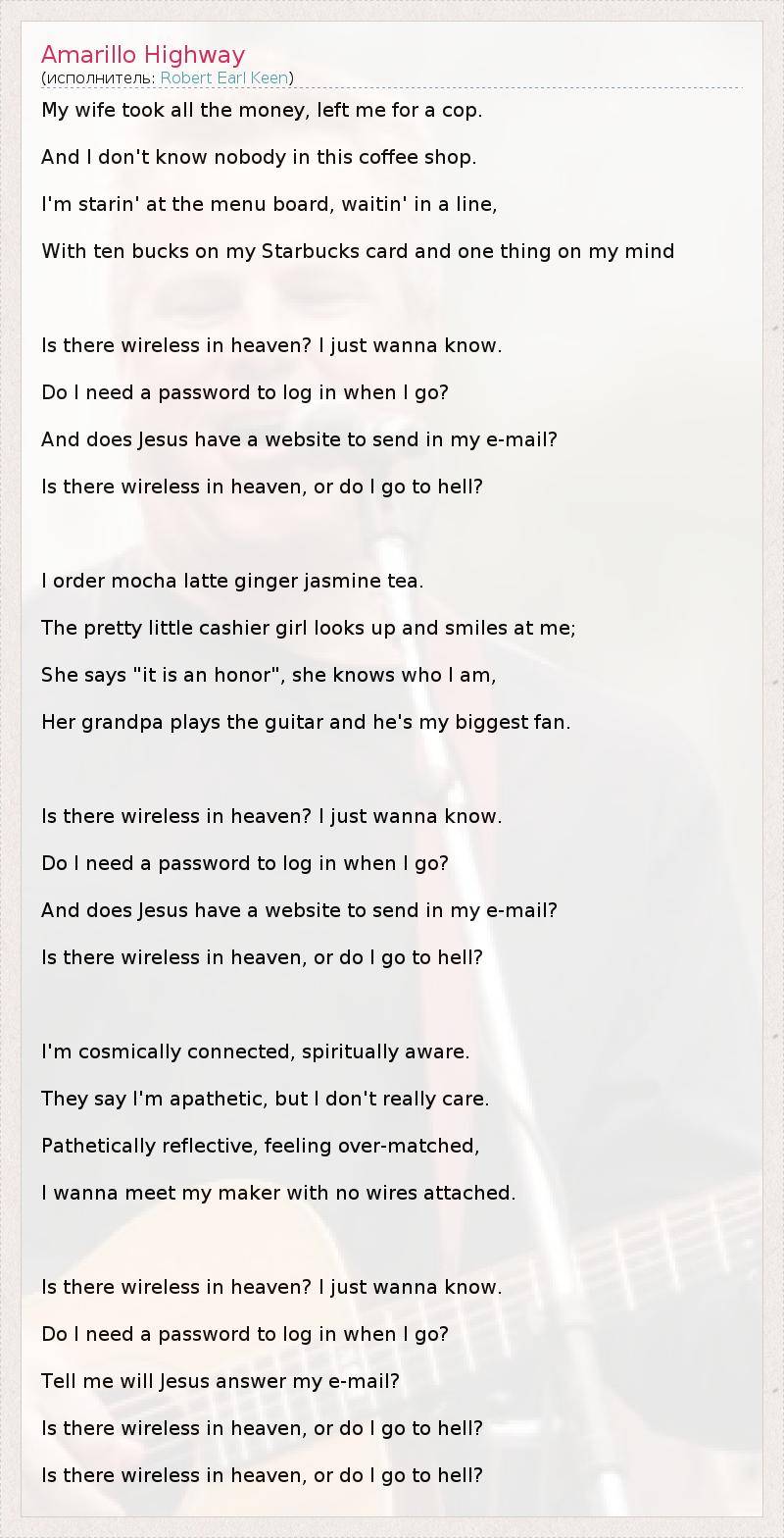 My wife took all the money, left me for a cop. And I don't know nobody in this coffee shop. I'm starin' at the menu board, waitin' in a line, With ten bucks on my Starbucks card and one thing on my mind Is there wireless in heaven? I just wanna know. Do I need a password to log in when I go? And does Jesus have a website to send in my e-mail? Is there wireless in heaven, or do I go to hell? I order mocha latte ginger jasmine tea. The pretty little cashier girl looks up and smiles at me; She says "it is an honor", she knows who I am, Her grandpa plays the guitar and he's my biggest fan. Is there wireless in heaven? I just wanna know. Do I need a password to log in when I go? And does Jesus have a website to send in my e-mail? Is there wireless in heaven, or do I go to hell? I'm cosmically connected, spiritually aware. They say I'm apathetic, but I don't really care. Pathetically reflective, feeling over-matched, I wanna meet my maker with no wires attached. Is there wireless in heaven? I just wanna know. Do I need a password to log in when I go? Tell me will Jesus answer my e-mail? Is there wireless in heaven, or do I go to hell? Is there wireless in heaven, or do I go to hell?