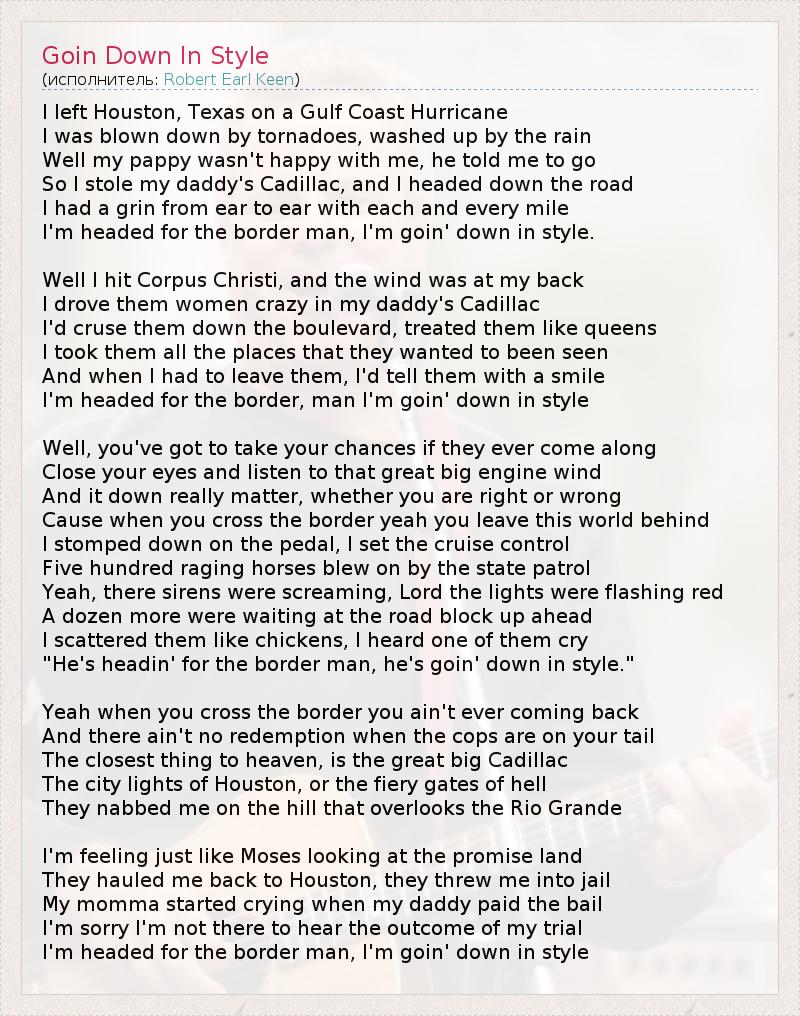 I left Houston, Texas on a Gulf Coast Hurricane I was blown down by tornadoes, washed up by the rain Well my pappy wasn't happy with me, he told me to go So I stole my daddy's Cadillac, and I headed down the road I had a grin from ear to ear with each and every mile I'm headed for the border man, I'm goin' down in style. Well I hit Corpus Christi, and the wind was at my back I drove them women crazy in my daddy's Cadillac I'd cruse them down the boulevard, treated them like queens I took them all the places that they wanted to been seen And when I had to leave them, I'd tell them with a smile I'm headed for the border, man I'm goin' down in style Well, you've got to take your chances if they ever come along Close your eyes and listen to that great big engine wind And it down really matter, whether you are right or wrong Cause when you cross the border yeah you leave this world behind I stomped down on the pedal, I set the cruise control Five hundred raging horses blew on by the state patrol Yeah, there sirens were screaming, Lord the lights were flashing red A dozen more were waiting at the road block up ahead I scattered them like chickens, I heard one of them cry "He's headin' for the border man, he's goin' down in style." Yeah when you cross the border you ain't ever coming back And there ain't no redemption when the cops are on your tail The closest thing to heaven, is the great big Cadillac The city lights of Houston, or the fiery gates of hell They nabbed me on the hill that overlooks the Rio Grande I'm feeling just like Moses looking at the promise land They hauled me back to Houston, they threw me into jail My momma started crying when my daddy paid the bail I'm sorry I'm not there to hear the outcome of my trial I'm headed for the border man, I'm goin' down in style