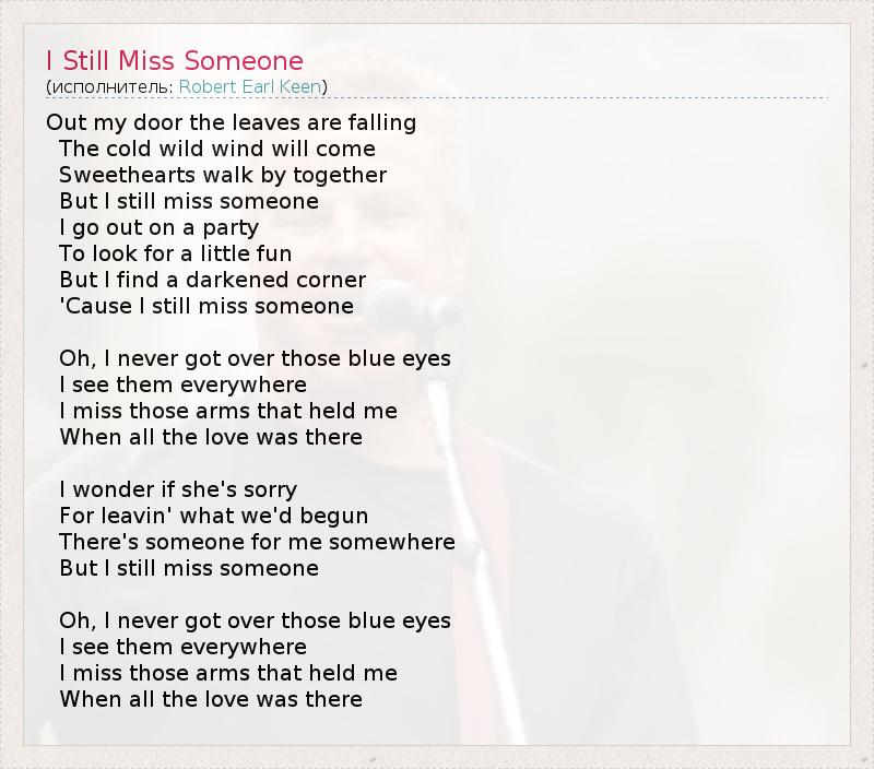 Out my door the leaves are falling The cold wild wind will come Sweethearts walk by together But I still miss someone I go out on a party To look for a little fun But I find a darkened corner 'Cause I still miss someone Oh, I never got over those blue eyes I see them everywhere I miss those arms that held me When all the love was there I wonder if she's sorry For leavin' what we'd begun There's someone for me somewhere But I still miss someone Oh, I never got over those blue eyes I see them everywhere I miss those arms that held me When all the love was there