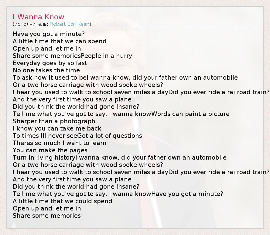 Have you got a minute? A little time that we can spend Open up and let me in Share some memoriesPeople in a hurry Everyday goes by so fast No one takes the time To ask how it used to beI wanna know, did your father own an automobile Or a two horse carriage with wood spoke wheels? I hear you used to walk to school seven miles a dayDid you ever ride a railroad train? And the very first time you saw a plane Did you think the world had gone insane? Tell me what you've got to say, I wanna knowWords can paint a picture Sharper than a photograph I know you can take me back To times Ill never seeGot a lot of questions Theres so much I want to learn You can make the pages Turn in living historyI wanna know, did your father own an automobile Or a two horse carriage with wood spoke wheels? I hear you used to walk to school seven miles a dayDid you ever ride a railroad train? And the very first time you saw a plane Did you think the world had gone insane? Tell me what you've got to say, I wanna knowHave you got a minute? A little time that we could spend Open up and let me in Share some memories