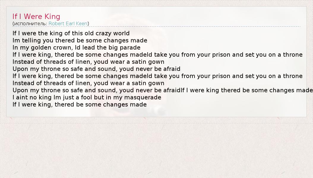 If I were the king of this old crazy world Im telling you thered be some changes made In my golden crown, Id lead the big parade If I were king, thered be some changes madeId take you from your prison and set you on a throne Instead of threads of linen, youd wear a satin gown Upon my throne so safe and sound, youd never be afraid If I were king, thered be some changes madeId take you from your prison and set you on a throne Instead of threads of linen, youd wear a satin gown Upon my throne so safe and sound, youd never be afraidIf I were king thered be some changes made I aint no king Im just a fool but in my masquerade If I were king, thered be some changes made