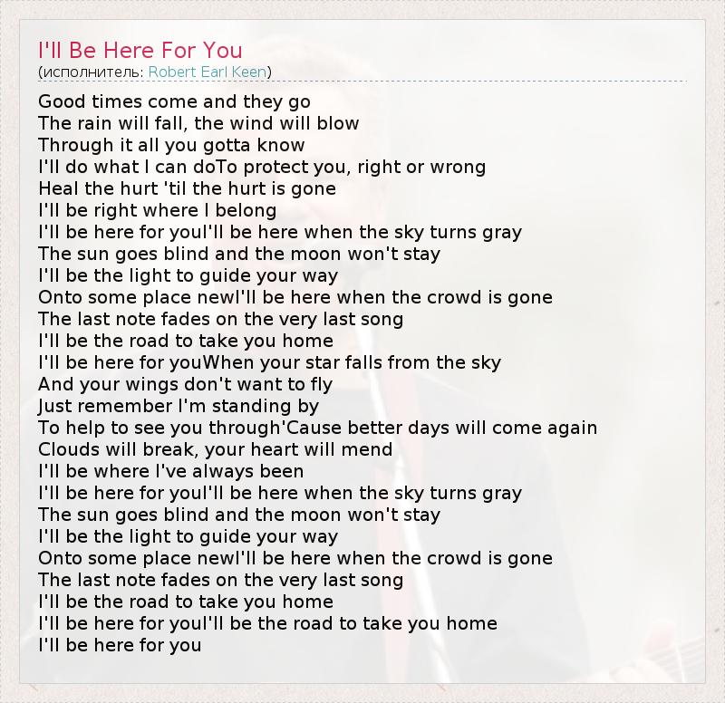 Good times come and they go The rain will fall, the wind will blow Through it all you gotta know I'll do what I can doTo protect you, right or wrong Heal the hurt 'til the hurt is gone I'll be right where I belong I'll be here for youI'll be here when the sky turns gray The sun goes blind and the moon won't stay I'll be the light to guide your way Onto some place newI'll be here when the crowd is gone The last note fades on the very last song I'll be the road to take you home I'll be here for youWhen your star falls from the sky And your wings don't want to fly Just remember I'm standing by To help to see you through'Cause better days will come again Clouds will break, your heart will mend I'll be where I've always been I'll be here for youI'll be here when the sky turns gray The sun goes blind and the moon won't stay I'll be the light to guide your way Onto some place newI'll be here when the crowd is gone The last note fades on the very last song I'll be the road to take you home I'll be here for youI'll be the road to take you home I'll be here for you
