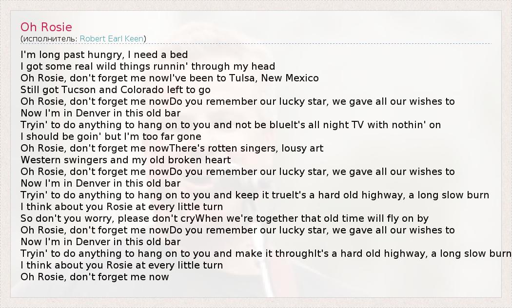 I'm long past hungry, I need a bed I got some real wild things runnin' through my head Oh Rosie, don't forget me nowI've been to Tulsa, New Mexico Still got Tucson and Colorado left to go Oh Rosie, don't forget me nowDo you remember our lucky star, we gave all our wishes to Now I'm in Denver in this old bar Tryin' to do anything to hang on to you and not be blueIt's all night TV with nothin' on I should be goin' but I'm too far gone Oh Rosie, don't forget me nowThere's rotten singers, lousy art Western swingers and my old broken heart Oh Rosie, don't forget me nowDo you remember our lucky star, we gave all our wishes to Now I'm in Denver in this old bar Tryin' to do anything to hang on to you and keep it trueIt's a hard old highway, a long slow burn I think about you Rosie at every little turn So don't you worry, please don't cryWhen we're together that old time will fly on by Oh Rosie, don't forget me nowDo you remember our lucky star, we gave all our wishes to Now I'm in Denver in this old bar Tryin' to do anything to hang on to you and make it throughIt's a hard old highway, a long slow burn I think about you Rosie at every little turn Oh Rosie, don't forget me now