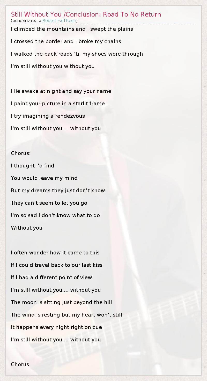 I climbed the mountains and I swept the plains I crossed the border and I broke my chains I walked the back roads 'til my shoes wore through I'm still without you without you I lie awake at night and say your name I paint your picture in a starlit frame I try imagining a rendezvous I'm still without you.... without you Chorus: l thought I'd find You would leave my mind But my dreams they just don't know They can't seem to let you go I'm so sad I don't know what to do Without you I often wonder how it came to this If I could travel back to our last kiss If I had a different point of view I'm still without you.... without you The moon is sitting just beyond the hill The wind is resting but my heart won't still It happens every night right on cue I'm still without you.... without you Chorus