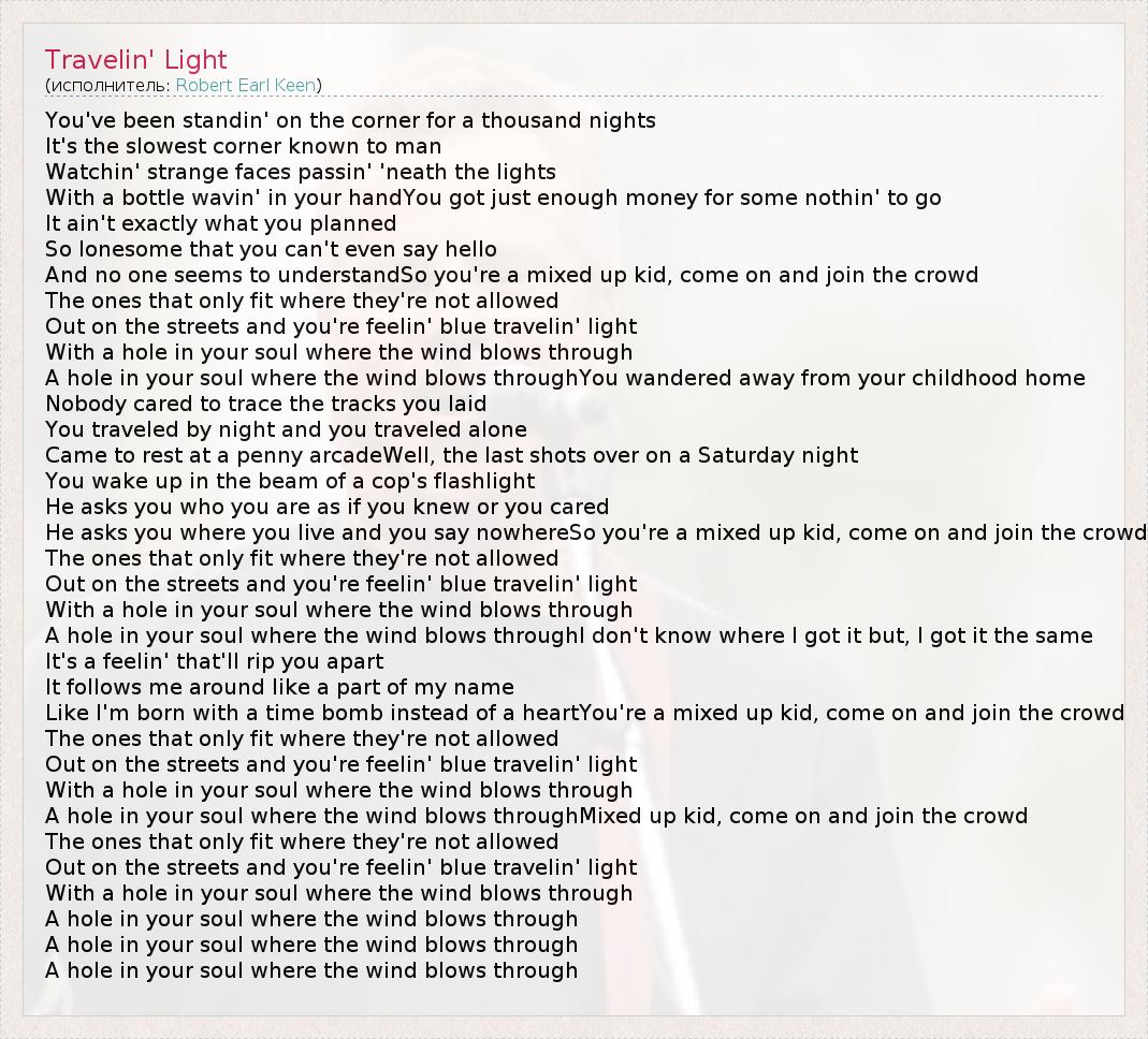 А как ты думаешь, о чем песня "Travelin' Light" ?