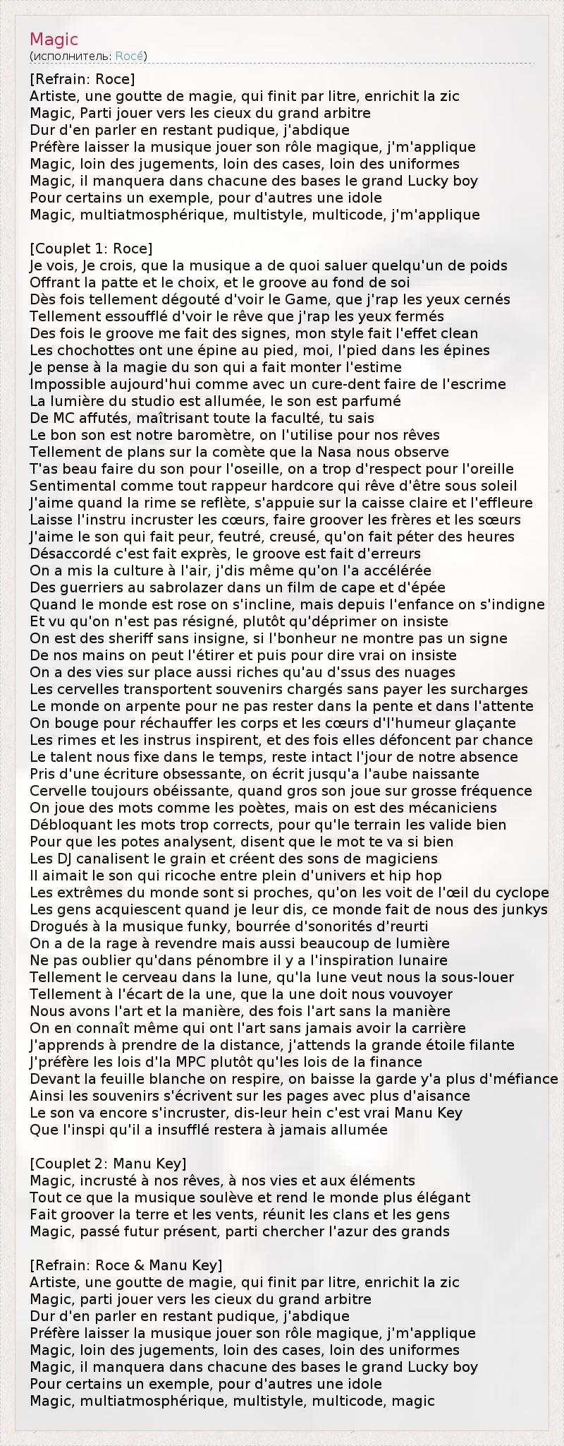 [Refrain: Roce] Artiste, une goutte de magie, qui finit par litre, enrichit la zic Magic, Parti jouer vers les cieux du grand arbitre Dur d'en parler en restant pudique, j'abdique Préfère laisser la musique jouer son rôle magique, j'm'applique Magic, loin des jugements, loin des cases, loin des uniformes Magic, il manquera dans chacune des bases le grand Lucky boy Pour certains un exemple, pour d'autres une idole Magic, multiatmosphérique, multistyle, multicode, j'm'applique [Couplet 1: Roce] Je vois, Je crois, que la musique a de quoi saluer quelqu'un de poids Offrant la patte et le choix, et le groove au fond de soi Dès fois tellement dégouté d'voir le Game, que j'rap les yeux cernés Tellement essoufflé d'voir le rêve que j'rap les yeux fermés Des fois le groove me fait des signes, mon style fait l'effet clean Les chochottes ont une épine au pied, moi, l'pied dans les épines Je pense à la magie du son qui a fait monter l'estime Impossible aujourd'hui comme avec un cure-dent faire de l'escrime La lumière du studio est allumée, le son est parfumé De MC affutés, maîtrisant toute la faculté, tu sais Le bon son est notre baromètre, on l'utilise pour nos rêves Tellement de plans sur la comète que la Nasa nous observe T'as beau faire du son pour l'oseille, on a trop d'respect pour l'oreille Sentimental comme tout rappeur hardcore qui rêve d'être sous soleil J'aime quand la rime se reflète, s'appuie sur la caisse claire et l'effleure Laisse l'instru incruster les cœurs, faire groover les frères et les sœurs J'aime le son qui fait peur, feutré, creusé, qu'on fait péter des heures Désaccordé c'est fait exprès, le groove est fait d'erreurs On a mis la culture à l'air, j'dis même qu'on l'a accélérée Des guerriers au sabrolazer dans un film de cape et d'épée Quand le monde est rose on s'incline, mais depuis l'enfance on s'indigne Et vu qu'on n'est pas résigné, plutôt qu'déprimer on insiste On est des sheriff sans insigne, si l'bonheur ne montre pas un signe De nos mains on peut l'étirer et puis pour dire vrai on insiste On a des vies sur place aussi riches qu'au d'ssus des nuages Les cervelles transportent souvenirs chargés sans payer les surcharges Le monde on arpente pour ne pas rester dans la pente et dans l'attente On bouge pour réchauffer les corps et les cœurs d'l'humeur glaçante Les rimes et les instrus inspirent, et des fois elles défoncent par chance Le talent nous fixe dans le temps, reste intact l'jour de notre absence Pris d'une écriture obsessante, on écrit jusqu'a l'aube naissante Cervelle toujours obéissante, quand gros son joue sur grosse fréquence On joue des mots comme les poètes, mais on est des mécaniciens Débloquant les mots trop corrects, pour qu'le terrain les valide bien Pour que les potes analysent, disent que le mot te va si bien Les DJ canalisent le grain et créent des sons de magiciens Il aimait le son qui ricoche entre plein d'univers et hip hop Les extrêmes du monde sont si proches, qu'on les voit de l'œil du cyclope Les gens acquiescent quand je leur dis, ce monde fait de nous des junkys Drogués à la musique funky, bourrée d'sonorités d'reurti On a de la rage à revendre mais aussi beaucoup de lumière Ne pas oublier qu'dans pénombre il y a l'inspiration lunaire Tellement le cerveau dans la lune, qu'la lune veut nous la sous-louer Tellement à l'écart de la une, que la une doit nous vouvoyer Nous avons l'art et la manière, des fois l'art sans la manière On en connaît même qui ont l'art sans jamais avoir la carrière J'apprends à prendre de la distance, j'attends la grande étoile filante J'préfère les lois d'la MPC plutôt qu'les lois de la finance Devant la feuille blanche on respire, on baisse la garde y'a plus d'méfiance Ainsi les souvenirs s'écrivent sur les pages avec plus d'aisance Le son va encore s'incruster, dis-leur hein c'est vrai Manu Key Que l'inspi qu'il a insufflé restera à jamais allumée [Couplet 2: Manu Key] Magic, incrusté à nos rêves, à nos vies et aux éléments Tout ce que la musique soulève et rend le monde plus élégant Fait groover la terre et les vents, réunit les clans et les gens Magic, passé futur présent, parti chercher l'azur des grands [Refrain: Roce & Manu Key] Artiste, une goutte de magie, qui finit par litre, enrichit la zic Magic, parti jouer vers les cieux du grand arbitre Dur d'en parler en restant pudique, j'abdique Préfère laisser la musique jouer son rôle magique, j'm'applique Magic, loin des jugements, loin des cases, loin des uniformes Magic, il manquera dans chacune des bases le grand Lucky boy Pour certains un exemple, pour d'autres une idole Magic, multiatmosphérique, multistyle, multicode, magic