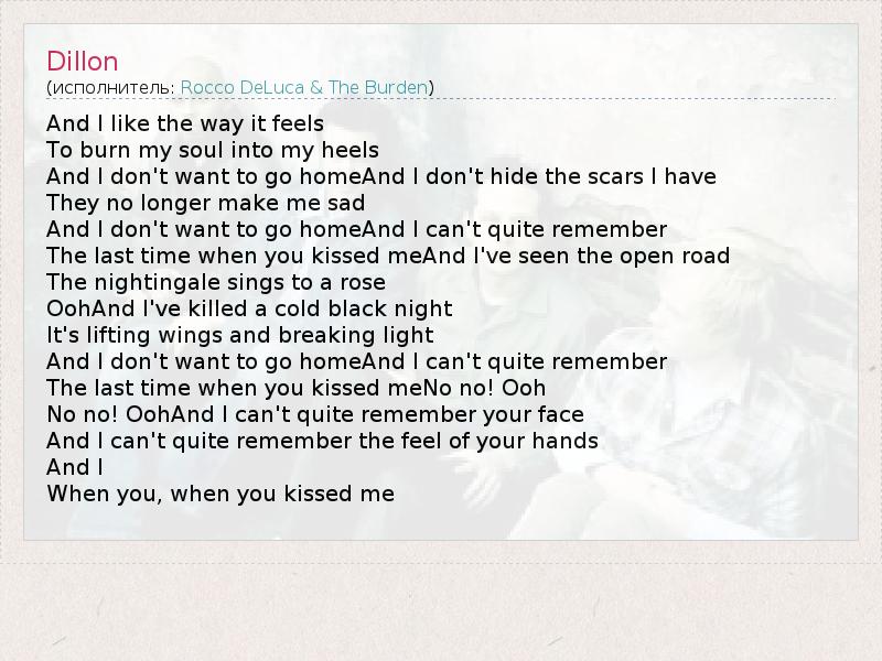 And I like the way it feels To burn my soul into my heels And I don't want to go homeAnd I don't hide the scars I have They no longer make me sad And I don't want to go homeAnd I can't quite remember The last time when you kissed meAnd I've seen the open road The nightingale sings to a rose OohAnd I've killed a cold black night It's lifting wings and breaking light And I don't want to go homeAnd I can't quite remember The last time when you kissed meNo no! Ooh No no! OohAnd I can't quite remember your face And I can't quite remember the feel of your hands And I When you, when you kissed me