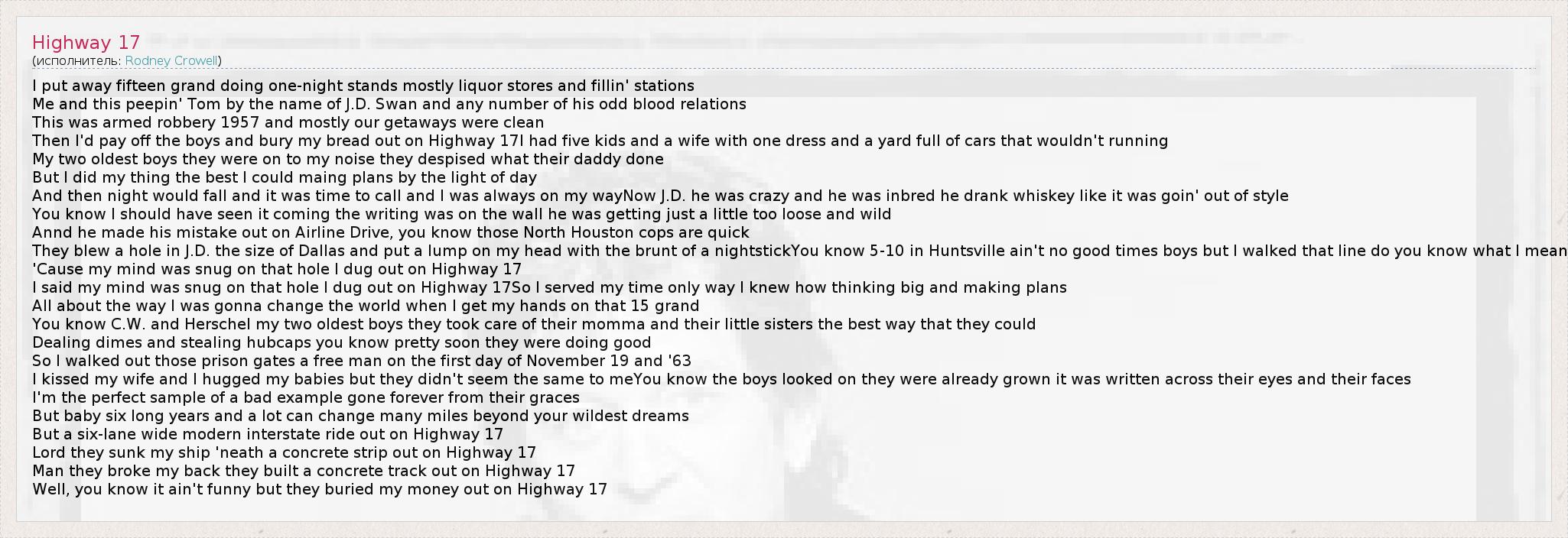 I put away fifteen grand doing one-night stands mostly liquor stores and fillin' stations Me and this peepin' Tom by the name of J.D. Swan and any number of his odd blood relations This was armed robbery 1957 and mostly our getaways were clean Then I'd pay off the boys and bury my bread out on Highway 17I had five kids and a wife with one dress and a yard full of cars that wouldn't running My two oldest boys they were on to my noise they despised what their daddy done But I did my thing the best I could maing plans by the light of day And then night would fall and it was time to call and I was always on my wayNow J.D. he was crazy and he was inbred he drank whiskey like it was goin' out of style You know I should have seen it coming the writing was on the wall he was getting just a little too loose and wild Annd he made his mistake out on Airline Drive, you know those North Houston cops are quick They blew a hole in J.D. the size of Dallas and put a lump on my head with the brunt of a nightstickYou know 5-10 in Huntsville ain't no good times boys but I walked that line do you know what I mean 'Cause my mind was snug on that hole I dug out on Highway 17 I said my mind was snug on that hole I dug out on Highway 17So I served my time only way I knew how thinking big and making plans All about the way I was gonna change the world when I get my hands on that 15 grand You know C.W. and Herschel my two oldest boys they took care of their momma and their little sisters the best way that they could Dealing dimes and stealing hubcaps you know pretty soon they were doing good So I walked out those prison gates a free man on the first day of November 19 and '63 I kissed my wife and I hugged my babies but they didn't seem the same to meYou know the boys looked on they were already grown it was written across their eyes and their faces I'm the perfect sample of a bad example gone forever from their graces But baby six long years and a lot can change many miles beyond your wildest dreams But a six-lane wide modern interstate ride out on Highway 17 Lord they sunk my ship 'neath a concrete strip out on Highway 17 Man they broke my back they built a concrete track out on Highway 17 Well, you know it ain't funny but they buried my money out on Highway 17