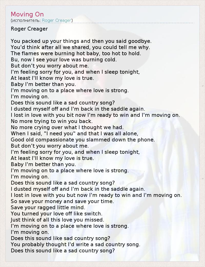 Roger Creager You packed up your things and then you said goodbye. You'd think after all we shared, you could tell me why. The flames were burning hot baby, too hot to hold. Bu, now I see your love was burning cold. But don't you worry about me. I'm feeling sorry for you, and when I sleep tonight, At least I'll know my love is true. Baby I'm better than you. I'm moving on to a place where love is strong. I'm moving on. Does this sound like a sad country song? I dusted myself off and I'm back in the saddle again. I lost in love with you bit now I'm ready to win and I'm moving on. No more trying to win you back. No more crying over what I thought we had. When I said, "I need you" and that I was all alone, Good old compassionate you slammed down the phone. But don't you worry about me. I'm feeling sorry for you, and when I sleep tonight, At least I'll know my love is true. Baby I'm better than you. I'm moving on to a place where love is strong. I'm moving on. Does this sound like a sad country song? I dusted myself off and I'm back in the saddle again. I lost in love with you but now I'm ready to win and I'm moving on. So save your money and save your time. Save your ragged little mind. You turned your love off like switch. Just think of all this love you missed. I'm moving on to a place where love is strong. I'm moving on. Does this sound like sad country song? You probably thought I'd write a sad country song. Does this sound like a sad country song?
