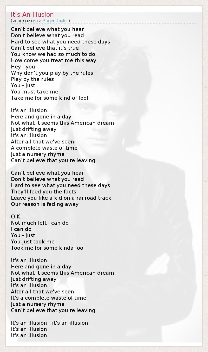 Can't believe what you hear Don't believe what you read Hard to see what you need these days Can't believe that it's true You know we had so much to do How come you treat me this way Hey - you Why don't you play by the rules Play by the rules You - just You must take me Take me for some kind of fool It's an illusion Here and gone in a day Not what it seems this American dream Just drifting away It's an illusion After all that we've seen A complete waste of time Just a nursery rhyme Can't believe that you're leaving Can't believe what you hear Don't believe what you read Hard to see what you need these days They'll feed you the facts Leave you like a kid on a railroad track Our reason is fading away O.K. Not much left I can do I can do You - just You just took me Took me for some kinda fool It's an illusion Here and gone in a day Not what it seems this American dream Just drifting away It's an illusion After all that we've seen It's a complete waste of time Just a nursery rhyme Can't believe that you're leaving It's an illusion - it's an illusion It's an illusion It's an illusion
