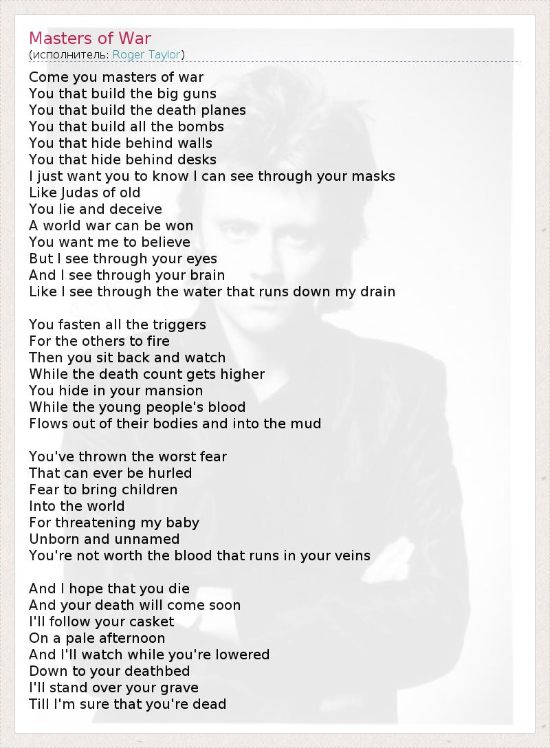 Come you masters of war You that build the big guns You that build the death planes You that build all the bombs You that hide behind walls You that hide behind desks I just want you to know I can see through your masks Like Judas of old You lie and deceive A world war can be won You want me to believe But I see through your eyes And I see through your brain Like I see through the water that runs down my drain You fasten all the triggers For the others to fire Then you sit back and watch While the death count gets higher You hide in your mansion While the young people's blood Flows out of their bodies and into the mud You've thrown the worst fear That can ever be hurled Fear to bring children Into the world For threatening my baby Unborn and unnamed You're not worth the blood that runs in your veins And I hope that you die And your death will come soon I'll follow your casket On a pale afternoon And I'll watch while you're lowered Down to your deathbed I'll stand over your grave Till I'm sure that you're dead