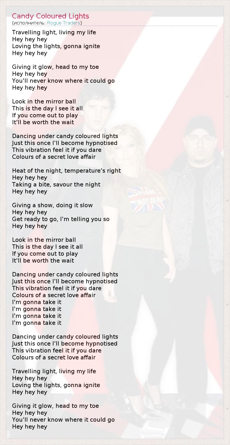 Travelling light, living my life Hey hey hey Loving the lights, gonna ignite Hey hey hey Giving it glow, head to my toe Hey hey hey You'll never know where it could go Hey hey hey Look in the mirror ball This is the day I see it all If you come out to play It'll be worth the wait Dancing under candy coloured lights Just this once I'll become hypnotised This vibration feel it if you dare Colours of a secret love affair Heat of the night, temperature's right Hey hey hey Taking a bite, savour the night Hey hey hey Giving a show, doing it slow Hey hey hey Get ready to go, I'm telling you so Hey hey hey Look in the mirror ball This is the day I see it all If you come out to play It'll be worth the wait Dancing under candy coloured lights Just this once I'll become hypnotised This vibration feel it if you dare Colours of a secret love affair I'm gonna take it I'm gonna take it I'm gonna take it I'm gonna take it Dancing under candy coloured lights Just this once I'll become hypnotised This vibration feel it if you dare Colours of a secret love affair Travelling light, living my life Hey hey hey Loving the lights, gonna ignite Hey hey hey Giving it glow, head to my toe Hey hey hey You'll never know where it could go Hey hey hey