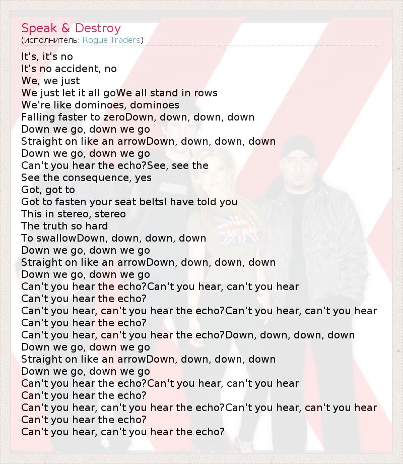 It's, it's no It's no accident, no We, we just We just let it all goWe all stand in rows We're like dominoes, dominoes Falling faster to zeroDown, down, down, down Down we go, down we go Straight on like an arrowDown, down, down, down Down we go, down we go Can't you hear the echo?See, see the See the consequence, yes Got, got to Got to fasten your seat beltsI have told you This in stereo, stereo The truth so hard To swallowDown, down, down, down Down we go, down we go Straight on like an arrowDown, down, down, down Down we go, down we go Can't you hear the echo?Can't you hear, can't you hear Can't you hear the echo? Can't you hear, can't you hear the echo?Can't you hear, can't you hear Can't you hear the echo? Can't you hear, can't you hear the echo?Down, down, down, down Down we go, down we go Straight on like an arrowDown, down, down, down Down we go, down we go Can't you hear the echo?Can't you hear, can't you hear Can't you hear the echo? Can't you hear, can't you hear the echo?Can't you hear, can't you hear Can't you hear the echo? Can't you hear, can't you hear the echo?