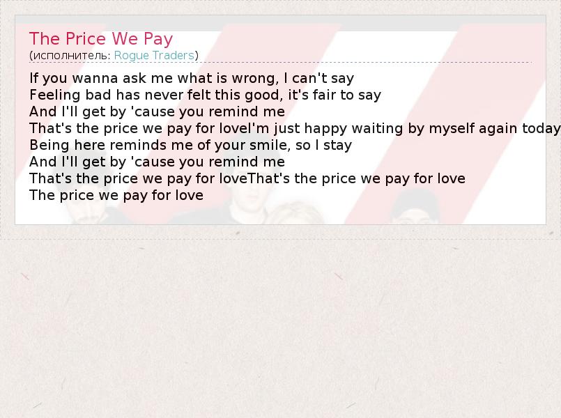 If you wanna ask me what is wrong, I can't say Feeling bad has never felt this good, it's fair to say And I'll get by 'cause you remind me That's the price we pay for loveI'm just happy waiting by myself again today Being here reminds me of your smile, so I stay And I'll get by 'cause you remind me That's the price we pay for loveThat's the price we pay for love The price we pay for love