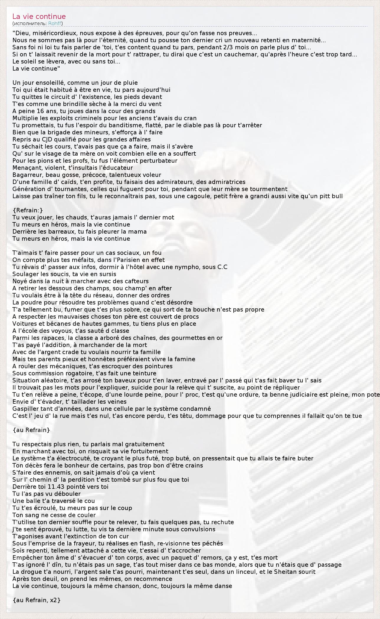 Это интересно:Плохой мальчик парижских предместий. Когда-то он был частью значимой для французской сцены тусовки Mafia k'1 Fry, но их пути разошлись, а сольное творчество Rohff от этого только выиграло. Его музыка, как и музыка Мафии, по большей части являет собой французский тип гангста рэпа, со всеми присущими атрибутами. Если сравнивать французский и американский образцы этого жанра, то французский видится... продолжение
