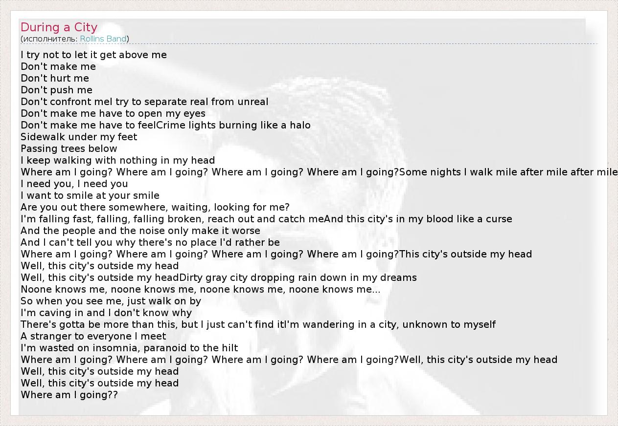I try not to let it get above me Don't make me Don't hurt me Don't push me Don't confront meI try to separate real from unreal Don't make me have to open my eyes Don't make me have to feelCrime lights burning like a halo Sidewalk under my feet Passing trees below I keep walking with nothing in my head Where am I going? Where am I going? Where am I going? Where am I going?Some nights I walk mile after mile after mile I need you, I need you I want to smile at your smile Are you out there somewhere, waiting, looking for me? I'm falling fast, falling, falling broken, reach out and catch meAnd this city's in my blood like a curse And the people and the noise only make it worse And I can't tell you why there's no place I'd rather be Where am I going? Where am I going? Where am I going? Where am I going?This city's outside my head Well, this city's outside my head Well, this city's outside my headDirty gray city dropping rain down in my dreams Noone knows me, noone knows me, noone knows me, noone knows me... So when you see me, just walk on by I'm caving in and I don't know why There's gotta be more than this, but I just can't find itI'm wandering in a city, unknown to myself A stranger to everyone I meet I'm wasted on insomnia, paranoid to the hilt Where am I going? Where am I going? Where am I going? Where am I going?Well, this city's outside my head Well, this city's outside my head Well, this city's outside my head Where am I going??