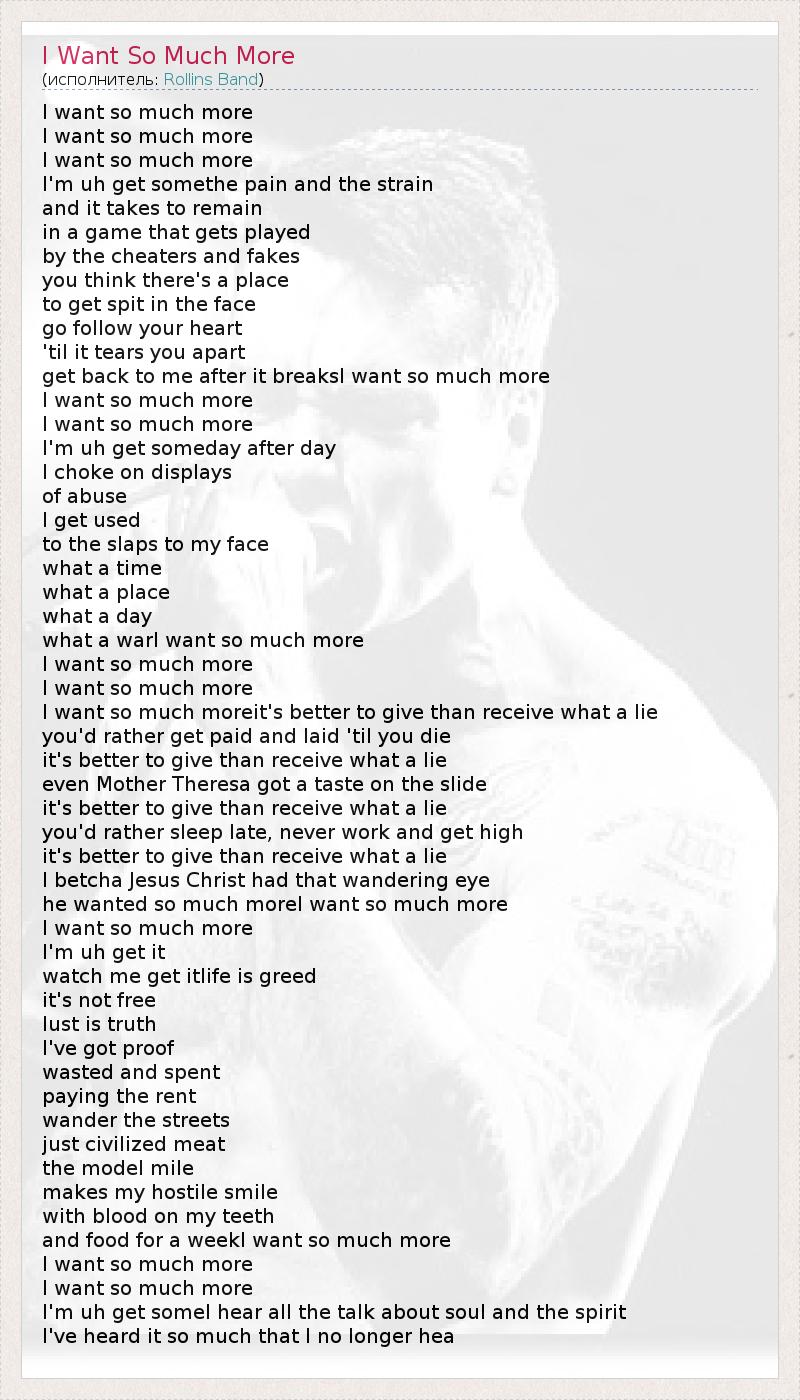 I want so much more I want so much more I want so much more I'm uh get somethe pain and the strain and it takes to remain in a game that gets played by the cheaters and fakes you think there's a place to get spit in the face go follow your heart 'til it tears you apart get back to me after it breaksI want so much more I want so much more I want so much more I'm uh get someday after day I choke on displays of abuse I get used to the slaps to my face what a time what a place what a day what a warI want so much more I want so much more I want so much more I want so much moreit's better to give than receive what a lie you'd rather get paid and laid 'til you die it's better to give than receive what a lie even Mother Theresa got a taste on the slide it's better to give than receive what a lie you'd rather sleep late, never work and get high it's better to give than receive what a lie I betcha Jesus Christ had that wandering eye he wanted so much moreI want so much more I want so much more I'm uh get it watch me get itlife is greed it's not free lust is truth I've got proof wasted and spent paying the rent wander the streets just civilized meat the model mile makes my hostile smile with blood on my teeth and food for a weekI want so much more I want so much more I want so much more I'm uh get someI hear all the talk about soul and the spirit I've heard it so much that I no longer hea