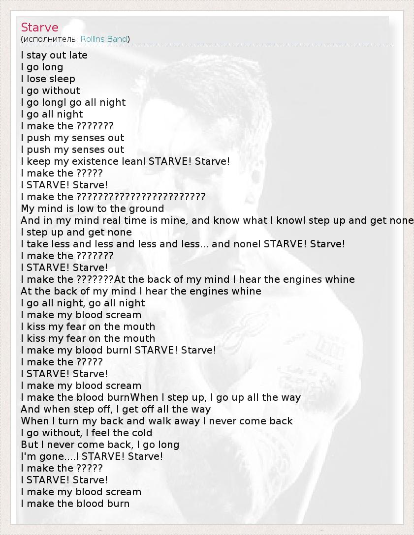 I stay out late I go long I lose sleep I go without I go longI go all night I go all night I make the ??????? I push my senses out I push my senses out I keep my existence leanI STARVE! Starve! I make the ????? I STARVE! Starve! I make the ???????????????????????? My mind is low to the ground And in my mind real time is mine, and know what I knowI step up and get none I step up and get none I take less and less and less and less... and noneI STARVE! Starve! I make the ??????? I STARVE! Starve! I make the ???????At the back of my mind I hear the engines whine At the back of my mind I hear the engines whine I go all night, go all night I make my blood scream I kiss my fear on the mouth I kiss my fear on the mouth I make my blood burnI STARVE! Starve! I make the ????? I STARVE! Starve! I make my blood scream I make the blood burnWhen I step up, I go up all the way And when step off, I get off all the way When I turn my back and walk away I never come back I go without, I feel the cold But I never come back, I go long I'm gone....I STARVE! Starve! I make the ????? I STARVE! Starve! I make my blood scream I make the blood burn