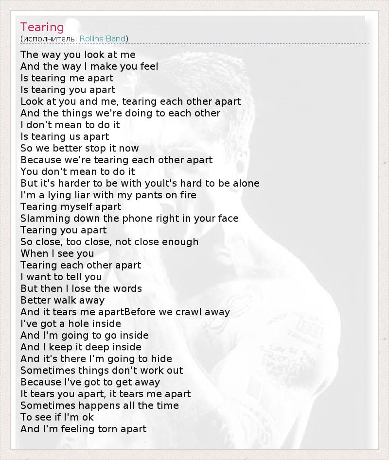 The way you look at me And the way I make you feel Is tearing me apart Is tearing you apart Look at you and me, tearing each other apart And the things we're doing to each other I don't mean to do it Is tearing us apart So we better stop it now Because we're tearing each other apart You don't mean to do it But it's harder to be with youIt's hard to be alone I'm a lying liar with my pants on fire Tearing myself apart Slamming down the phone right in your face Tearing you apart So close, too close, not close enough When I see you Tearing each other apart I want to tell you But then I lose the words Better walk away And it tears me apartBefore we crawl away I've got a hole inside And I'm going to go inside And I keep it deep inside And it's there I'm going to hide Sometimes things don't work out Because I've got to get away It tears you apart, it tears me apart Sometimes happens all the time To see if I'm ok And I'm feeling torn apart