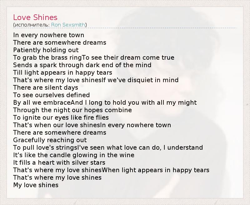 In every nowhere town There are somewhere dreams Patiently holding out To grab the brass ringTo see their dream come true Sends a spark through dark end of the mind Till light appears in happy tears That's where my love shinesIf we've disquiet in mind There are silent days To see ourselves defined By all we embraceAnd I long to hold you with all my might Through the night our hopes combine To ignite our eyes like fire flies That's when our love shinesIn every nowhere town There are somewhere dreams Gracefully reaching out To pull love's stringsI've seen what love can do, I understand It's like the candle glowing in the wine It fills a heart with silver stars That's where my love shinesWhen light appears in happy tears That's where my love shines My love shines